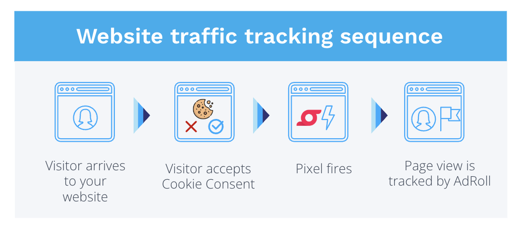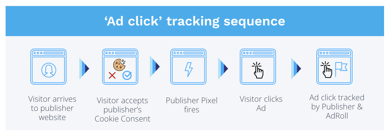 Before we go over the most common reasons why you may see ad clicks in the AdRoll ABM platform without any corresponding page views for the ad landing page is important to understand the tracking sequence for ad clicks vs page views.