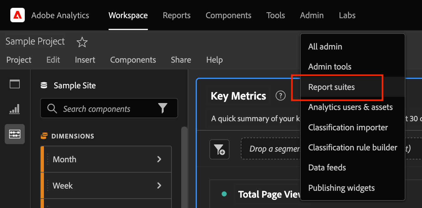- In Adobe Analytics, navigate to the Report Suite Manager by clicking “Report suites” under the Admin menu.