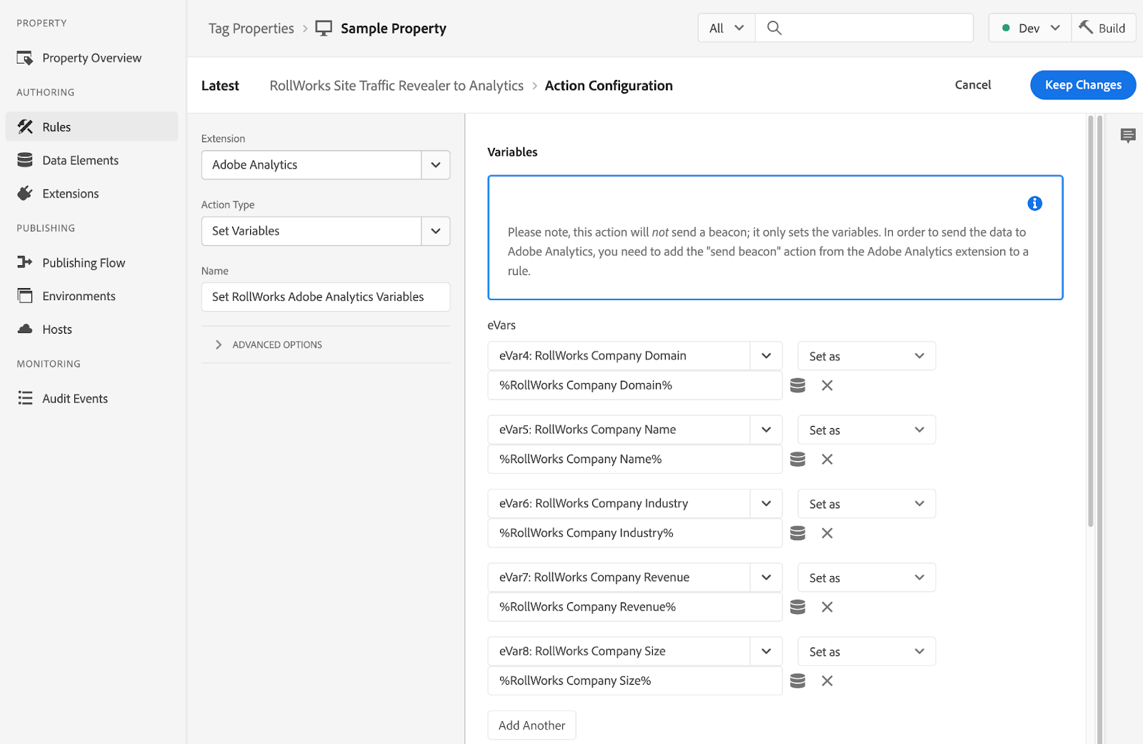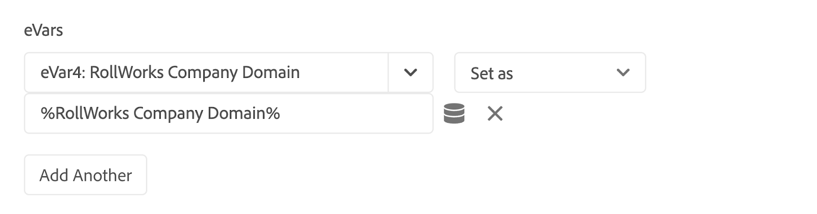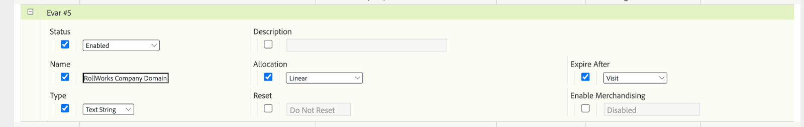 - Under “eVars” select the eVar for “RollWorks Company Domain”.