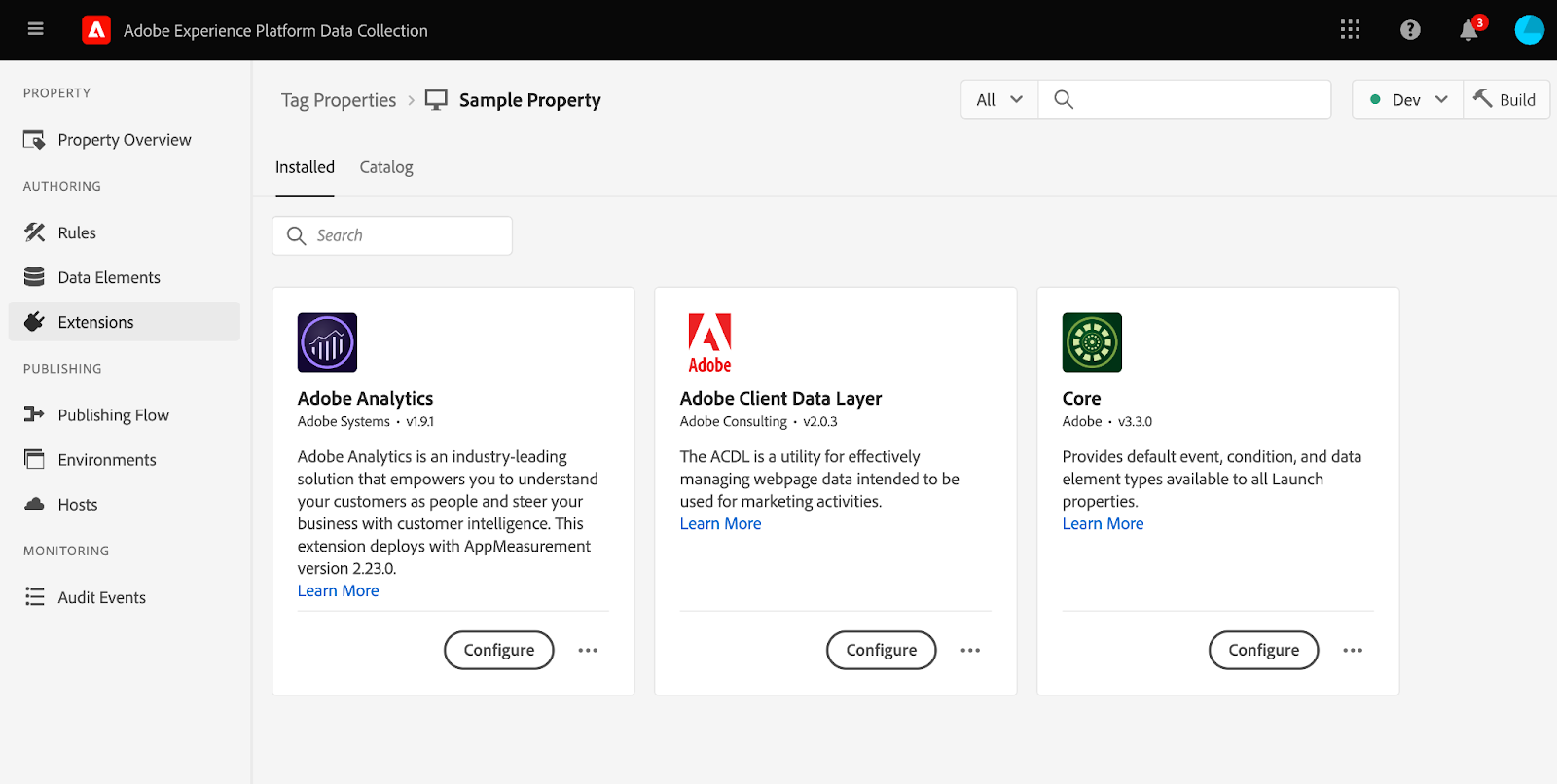- Navigate to “Extensions” and verify that the following extensions are installed, configured, and saved to your library: Adobe Analytics, Adobe Client Data Layer, Core.