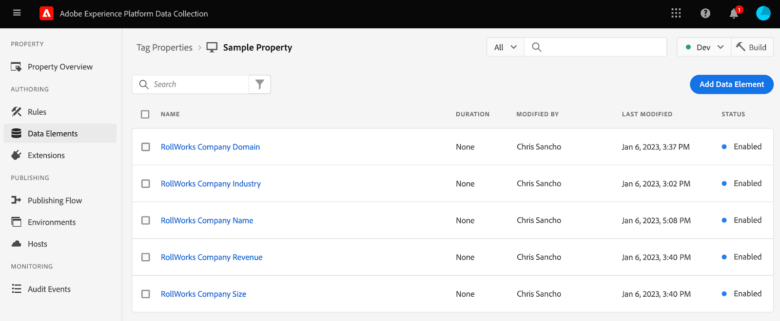 - Click the Data Element button and select the “RollWorks Company Domain” element.