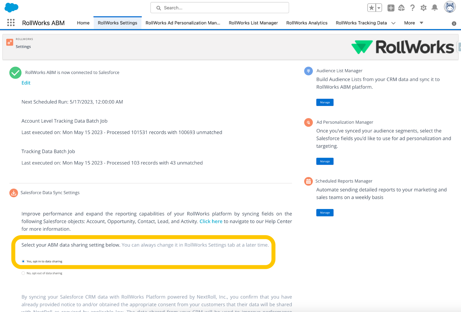 - Ensure the option Yes, opt-in data sharing under Select your ABM data sharing setting below.