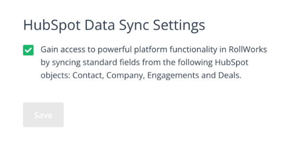 - Ensure the checkbox ‘HubSpot Data Sync Settings’ is selected and click Save.