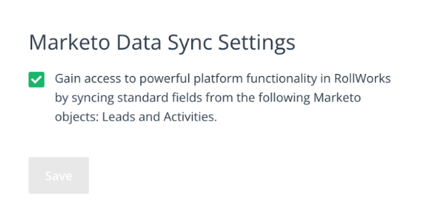 - Ensure the checkbox ‘Marketo Data Sync Settings’ is selected and click Save.