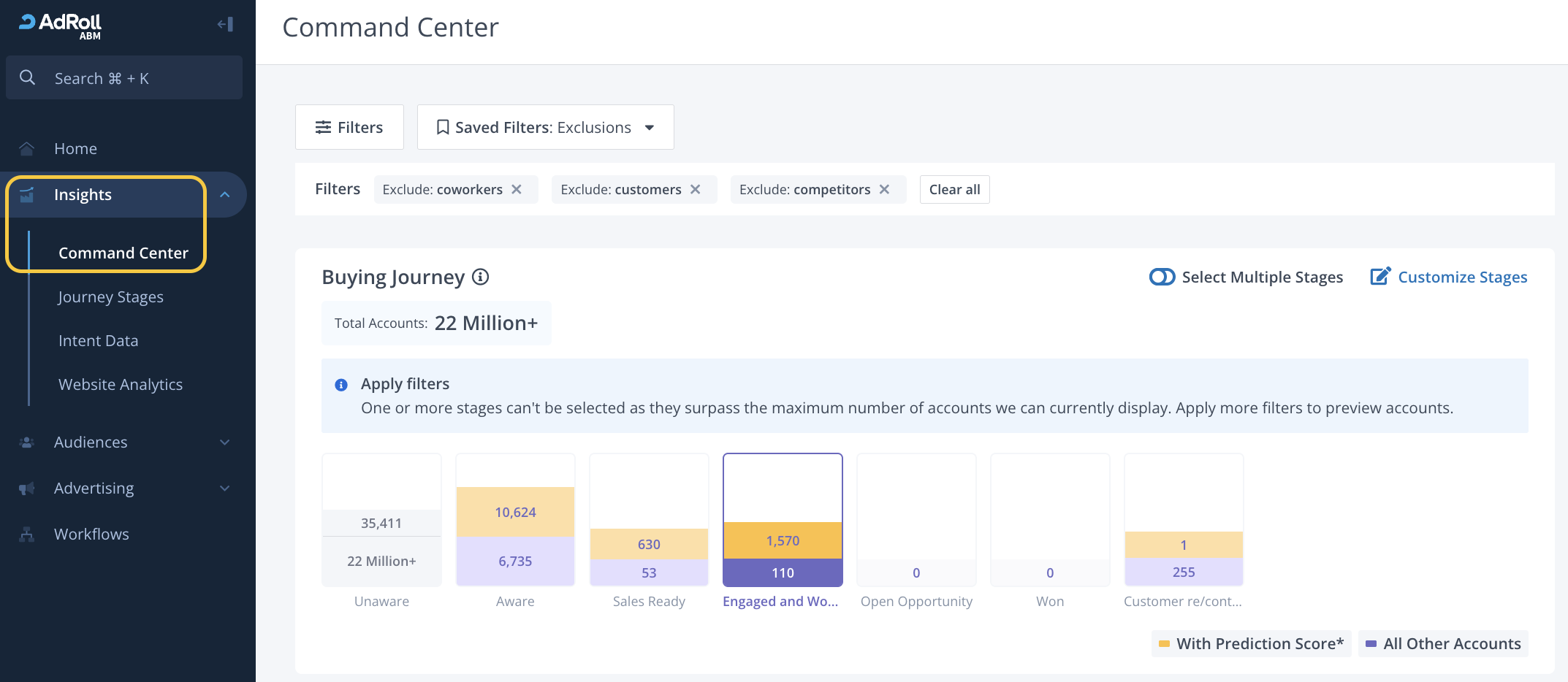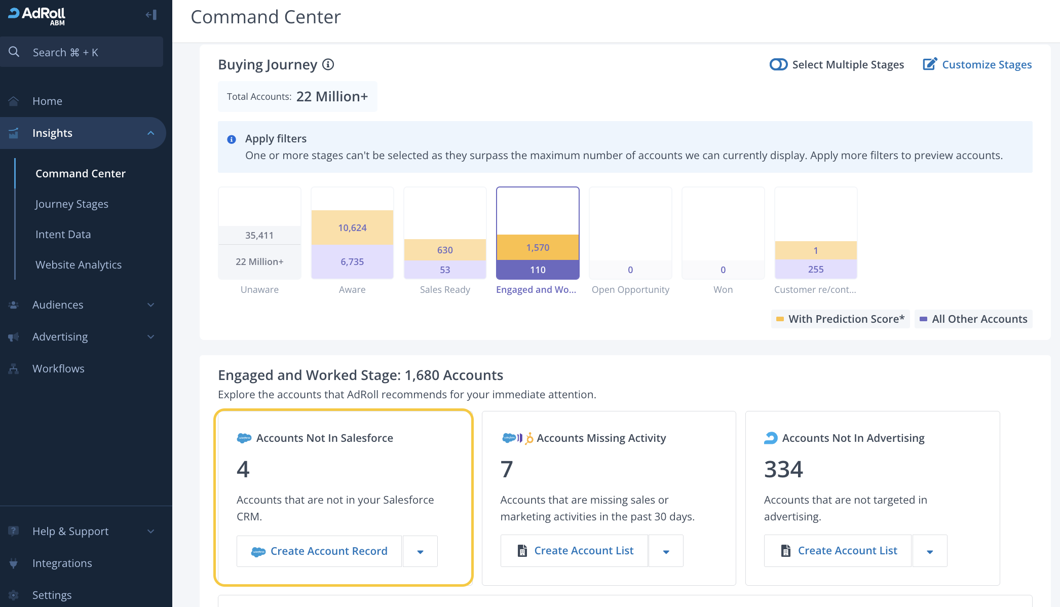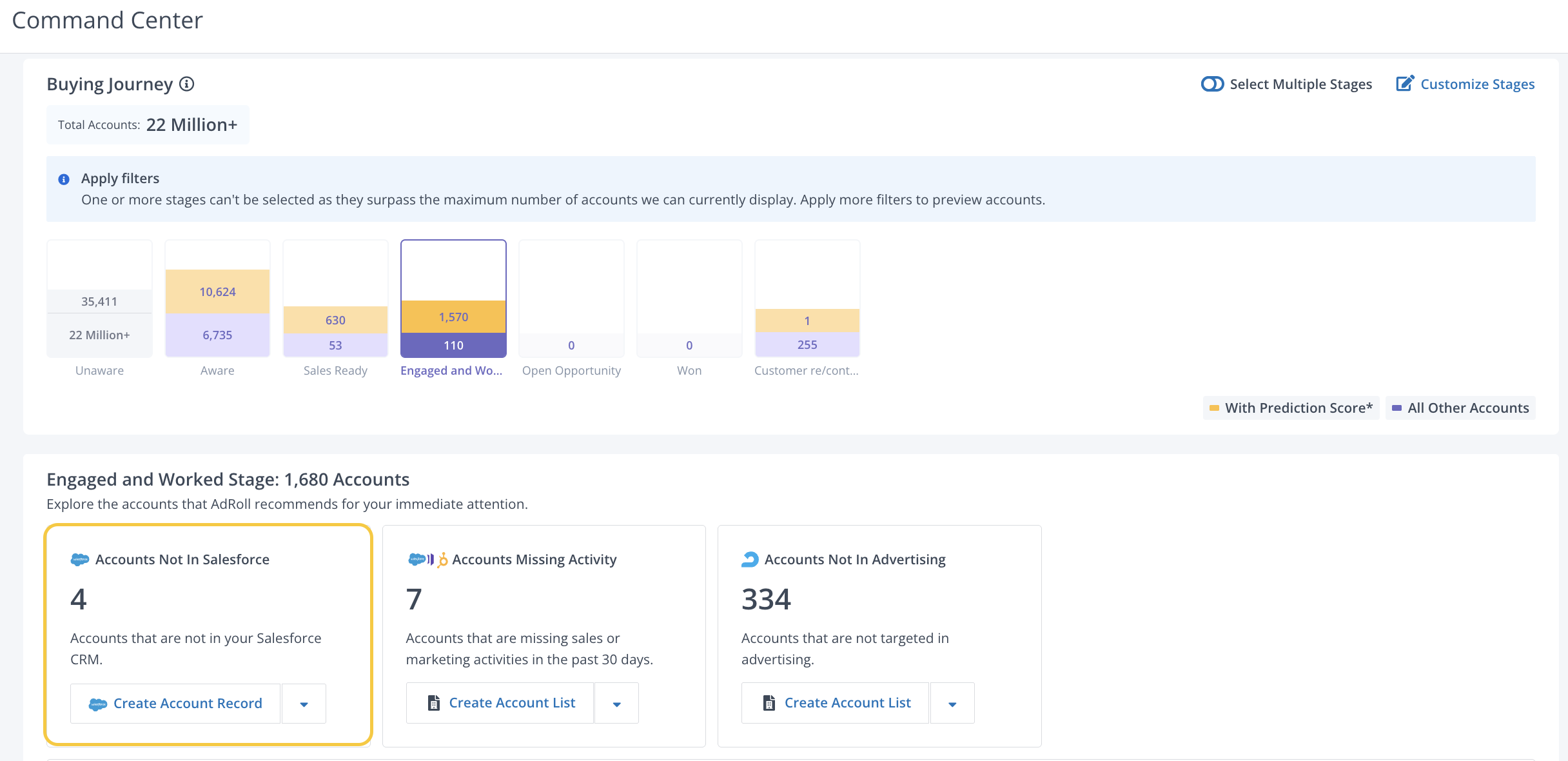 Several filters are available for you in the AdRoll Command Center to narrow down the number of accounts to push to Salesforce. You can apply filters like Firmographic Account data, ICP Fit Grade, Account List, Intent Data, and General Exclusions. Learn more here.