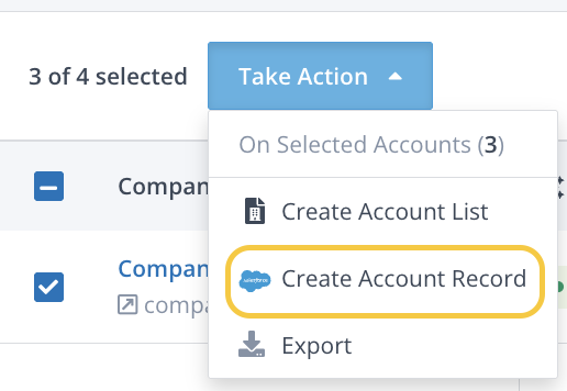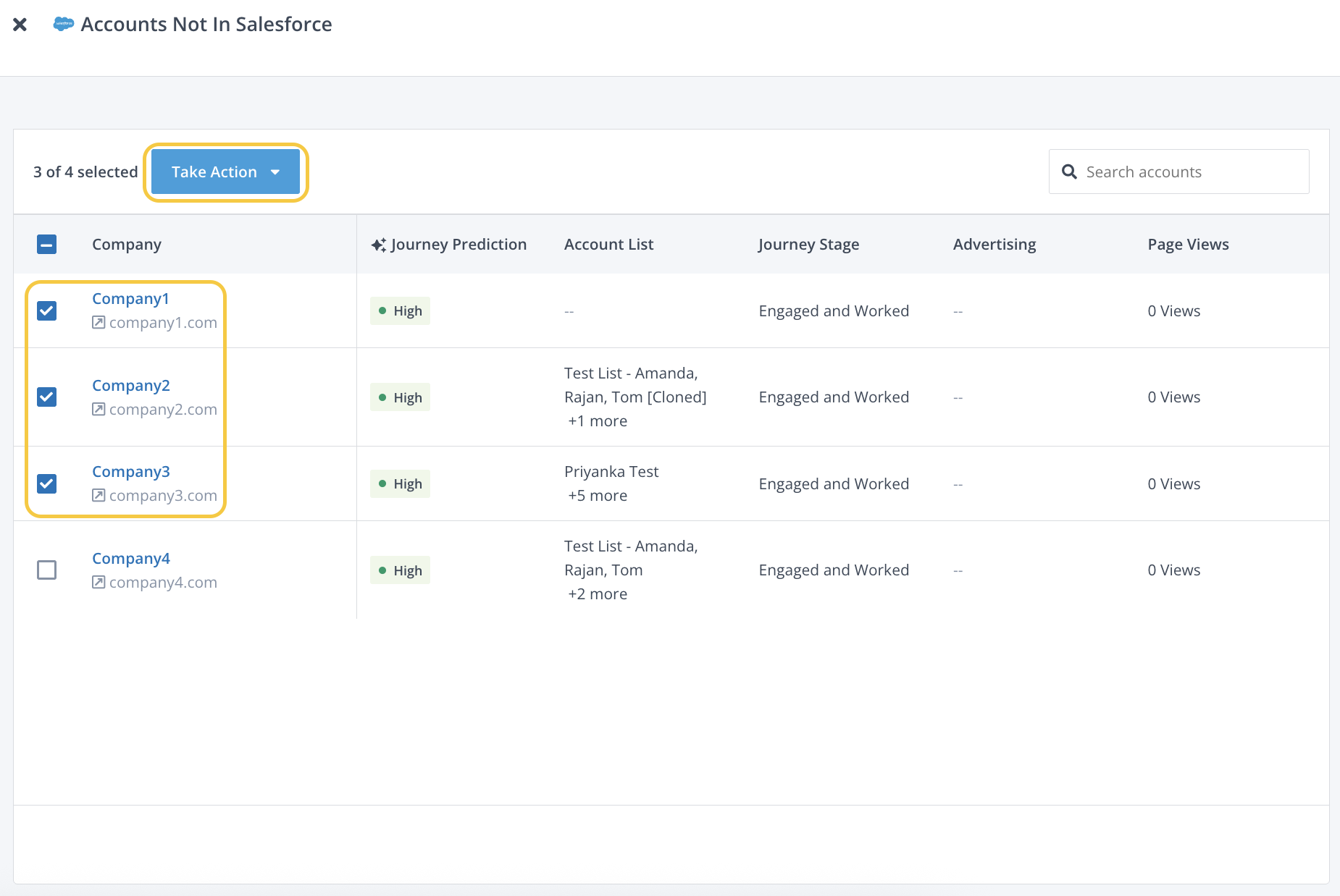 - Select the accounts that you wish to push to Salesforce and click Take Action. You can select all accounts displayed, or a subset of accounts to push to your CRM.