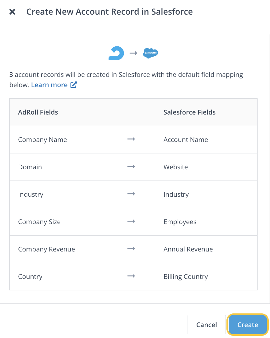 Access to pushing new account records to Salesforce is accessible through the AdRoll Command Center: