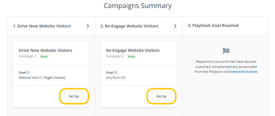 A Playbook is comprised of multiple campaigns outlined under Campaigns Summary. Click Set Up for the specific campaign that needs ads swapped out.