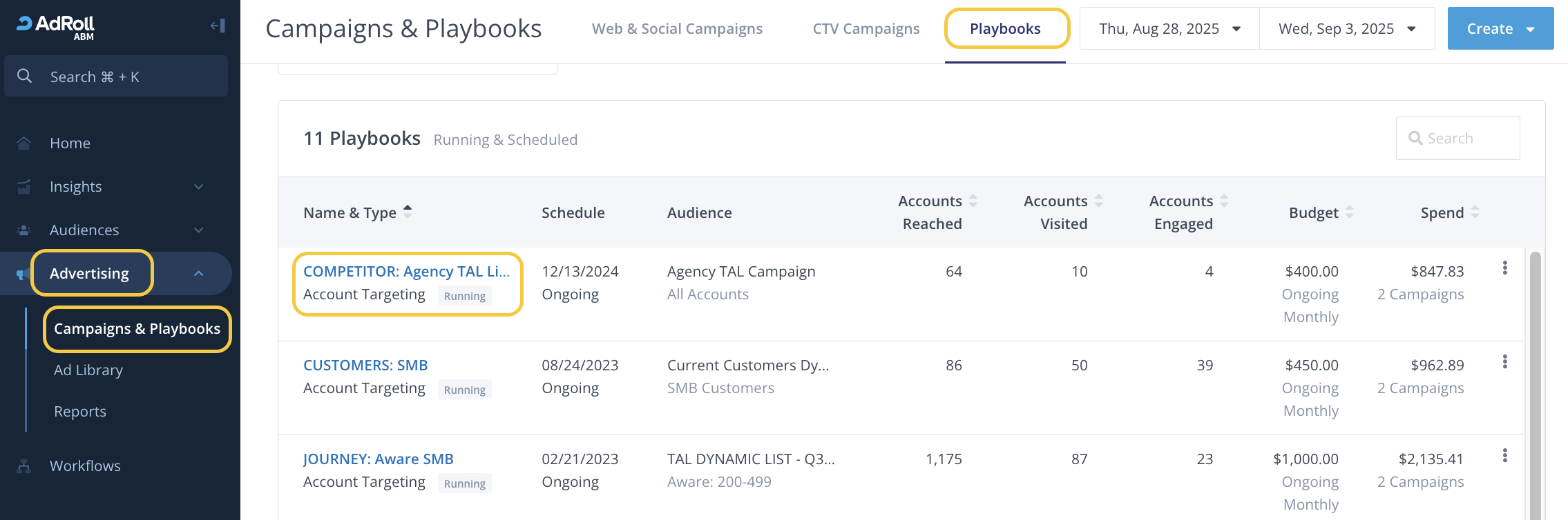 - Log in to AdRoll ABM and navigate to Advertising > Campaigns & Playbooks.