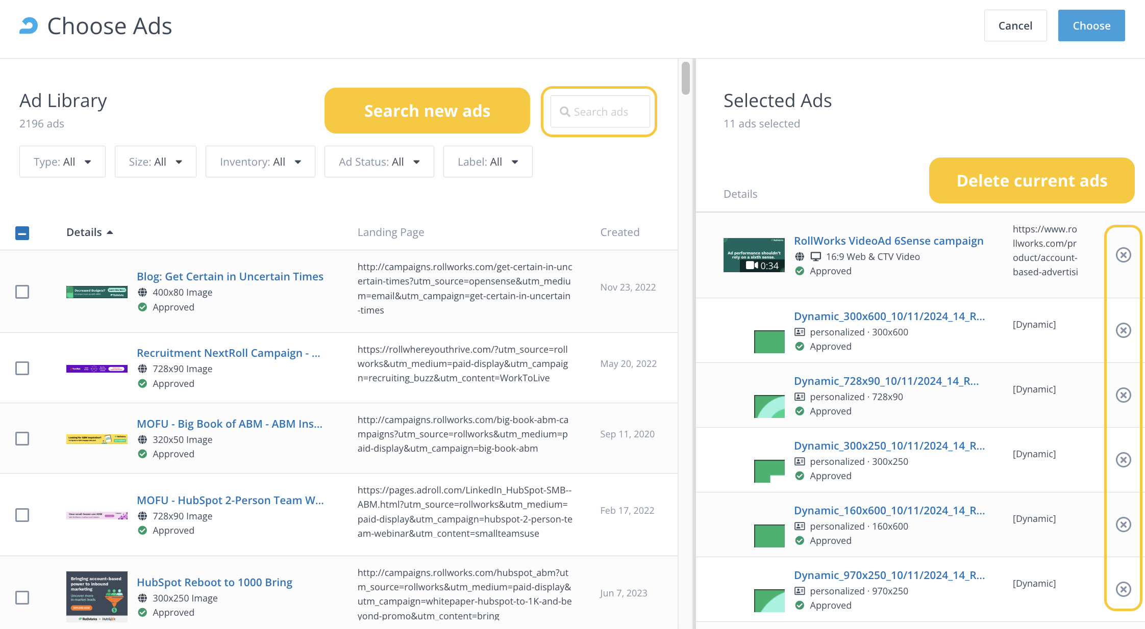 - On the next screen, you can delete the ads you don't want to use anymore and search and search for new ads.