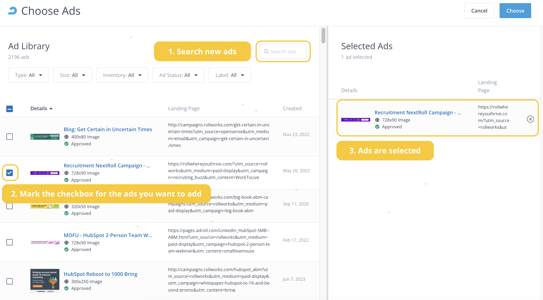 When adding existing ads to your campaign you can only select ads last modified within the last year. If you need to select ads last modified more than a year ago, navigate to the Ad Library and make any edit to the ad. The ad will now be displayed in the campaign setup page.