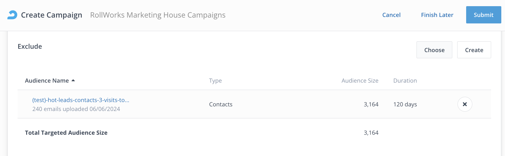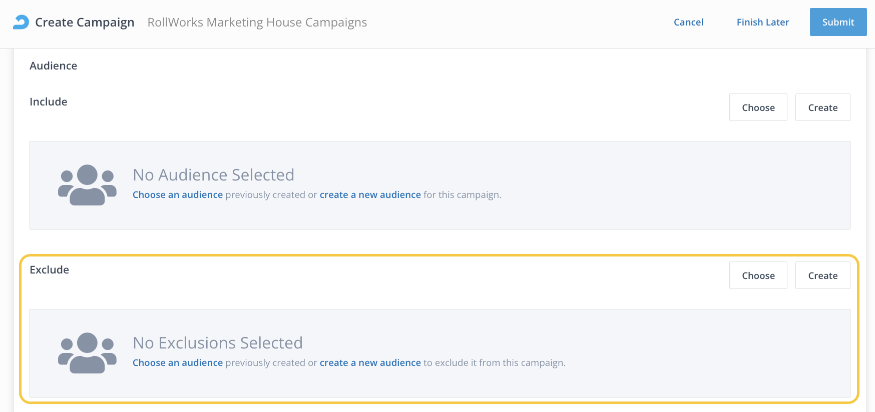 Campaigns offer your audience flexibility and allow you to exclude specific audiences from being targeted. When excluding an audience from a campaign, we will not display ads to people in that Audience. You can exclude both: