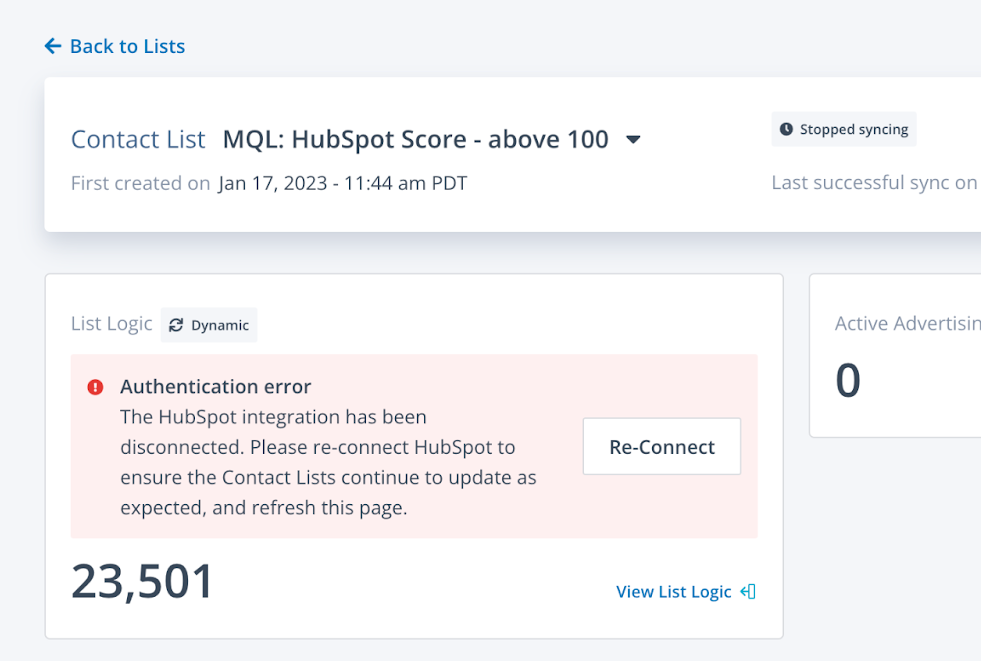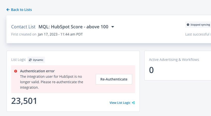 - Click here to learn how to re-authenticate the HubSpot integration.
