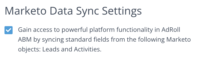 In addition to integrating with a third-party partner like Salesforce, HubSpot, or Marketo, you must ensure that the Data Sync Settings checkbox is marked as active in the AdRoll ABM platform; otherwise, syncing data between systems will be disabled.