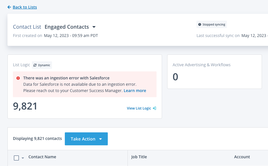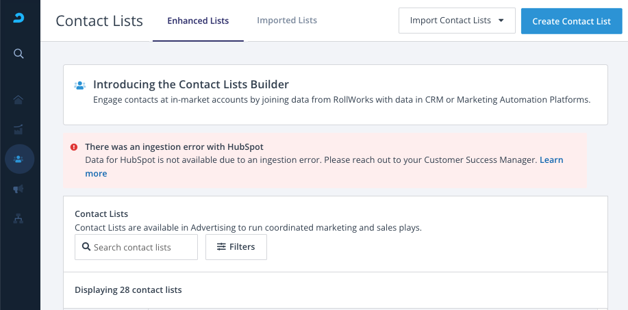 In order to ensure your Enhanced Contact Lists are up to date, we ingest new data from Salesforce, HubSpot, Marketo each day. Occasionally, there may be an error when trying to ingest new data from these data sources.