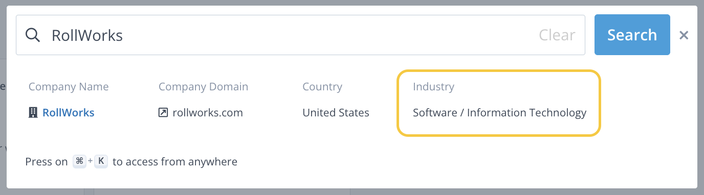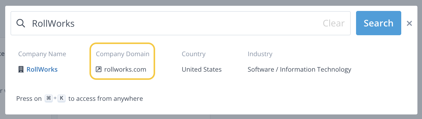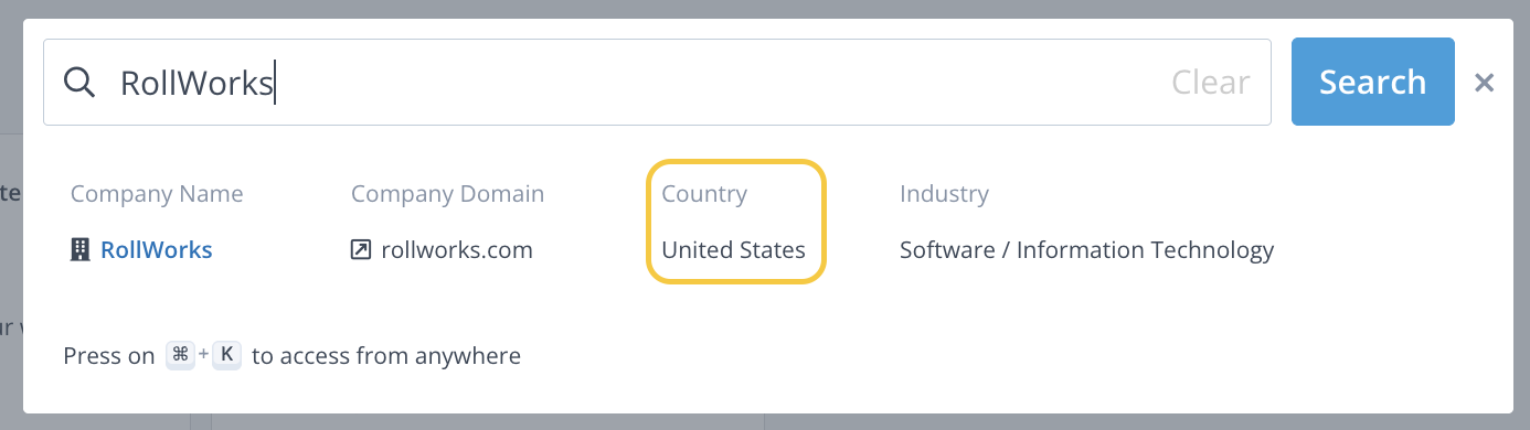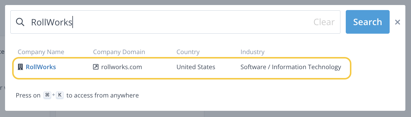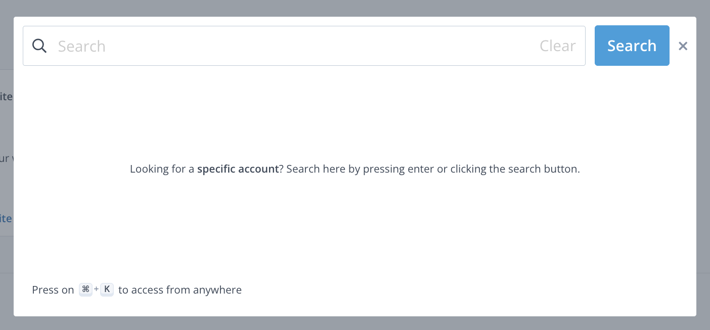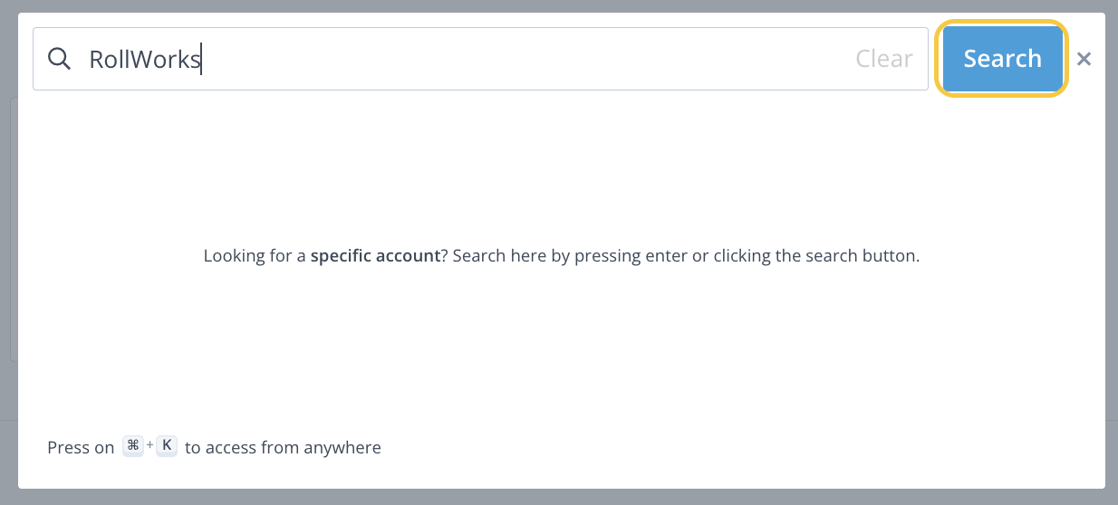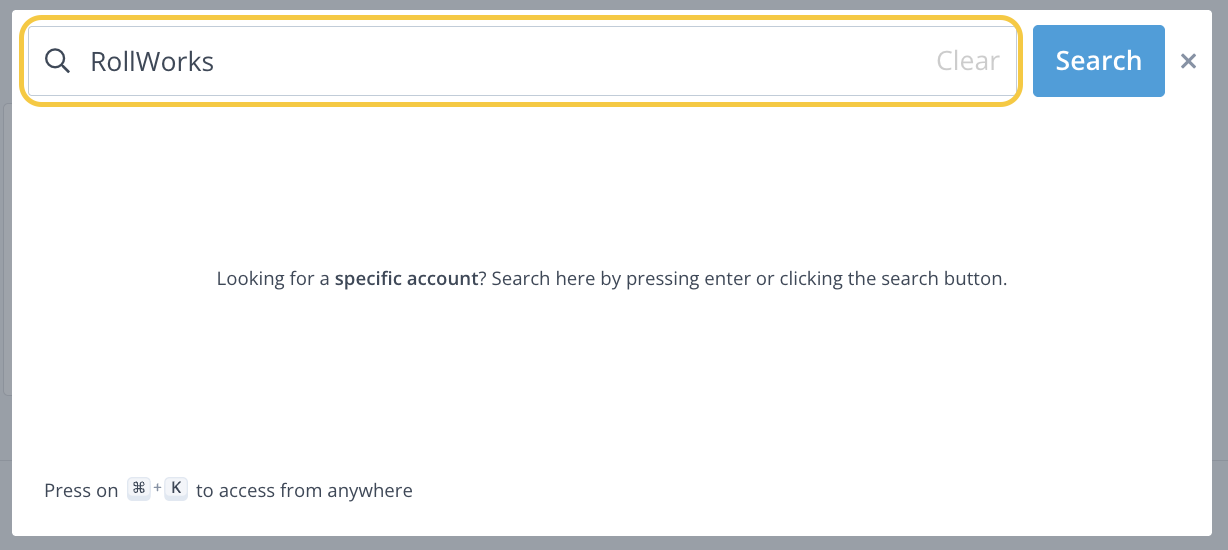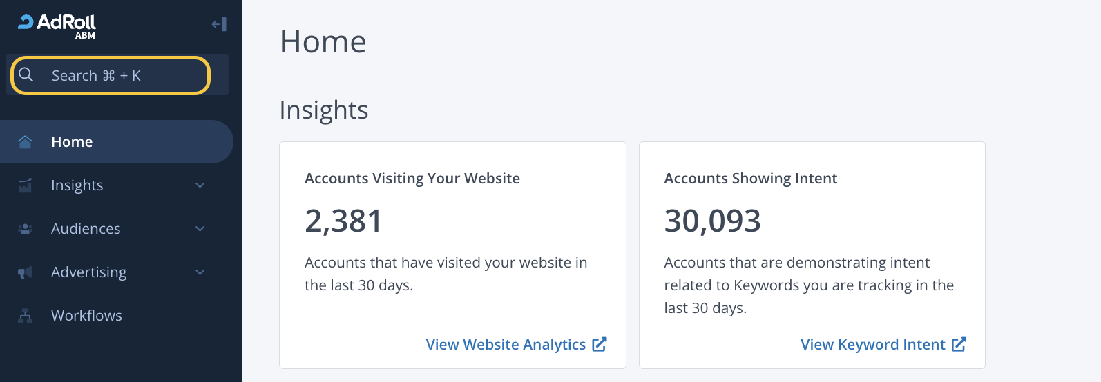 Also, you can access the Account Search Bar by pressing Command + K (CTRL + K) on your keyboard from any place within the AdRoll ABM platform.
