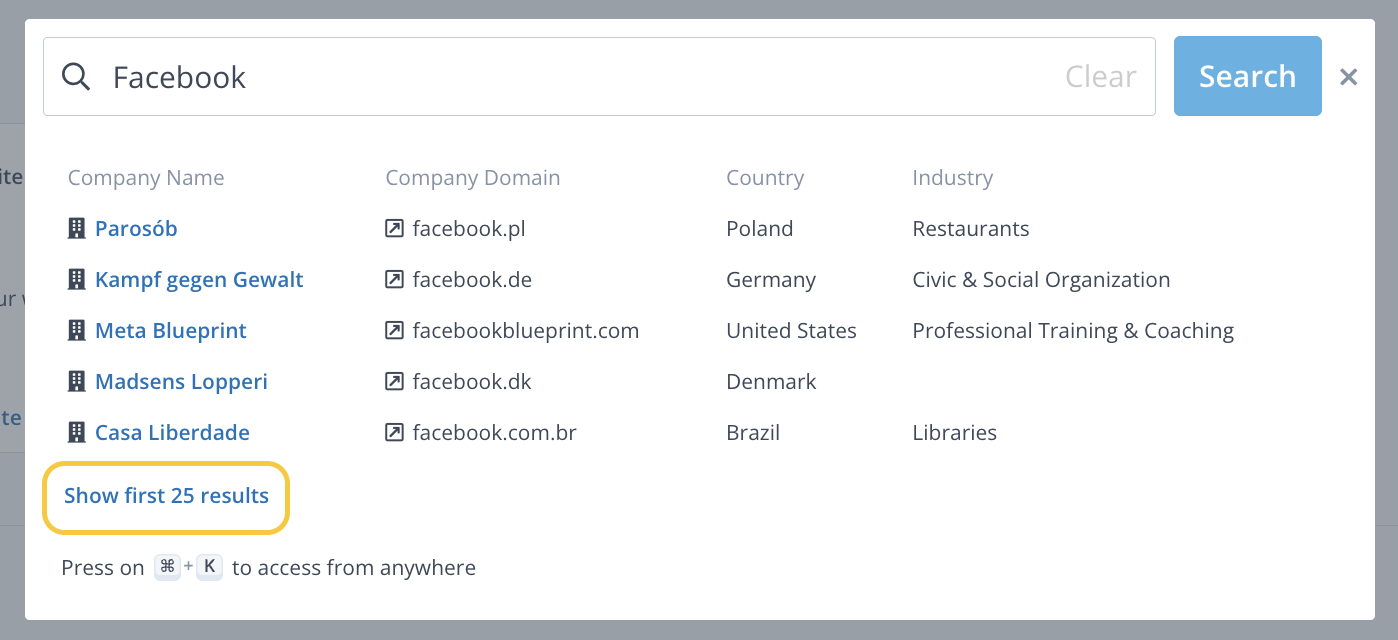 In case there is more than one account with the name you have entered, you will see a list of accounts. To extend the list, click 'Show first 25 results'.