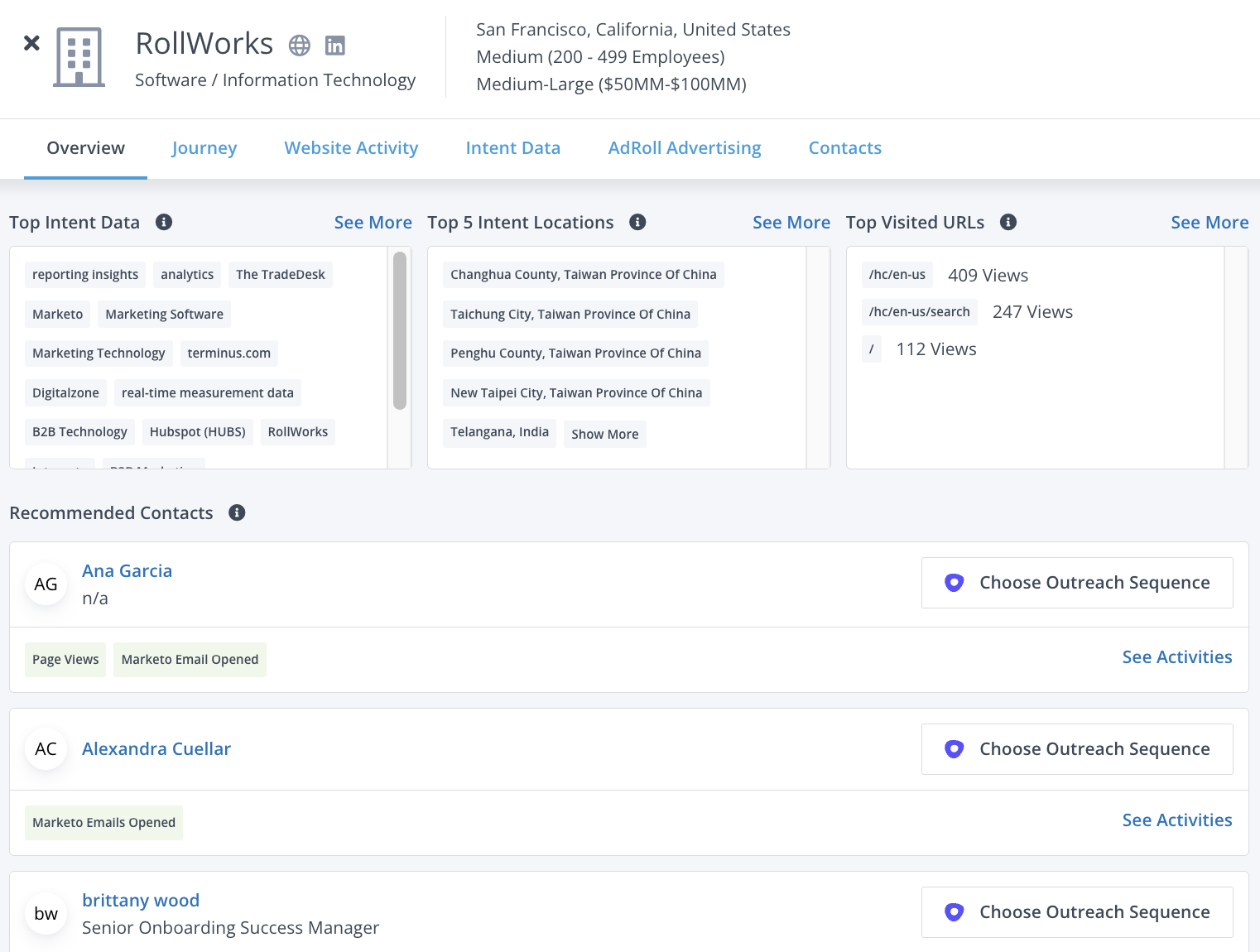 Enter the company name of the account that you are looking for in the Account Search Bar. Do not enter the full domain URL. For example, if you wish to find the AdRoll account, enter AdRoll, not www.adroll.com.