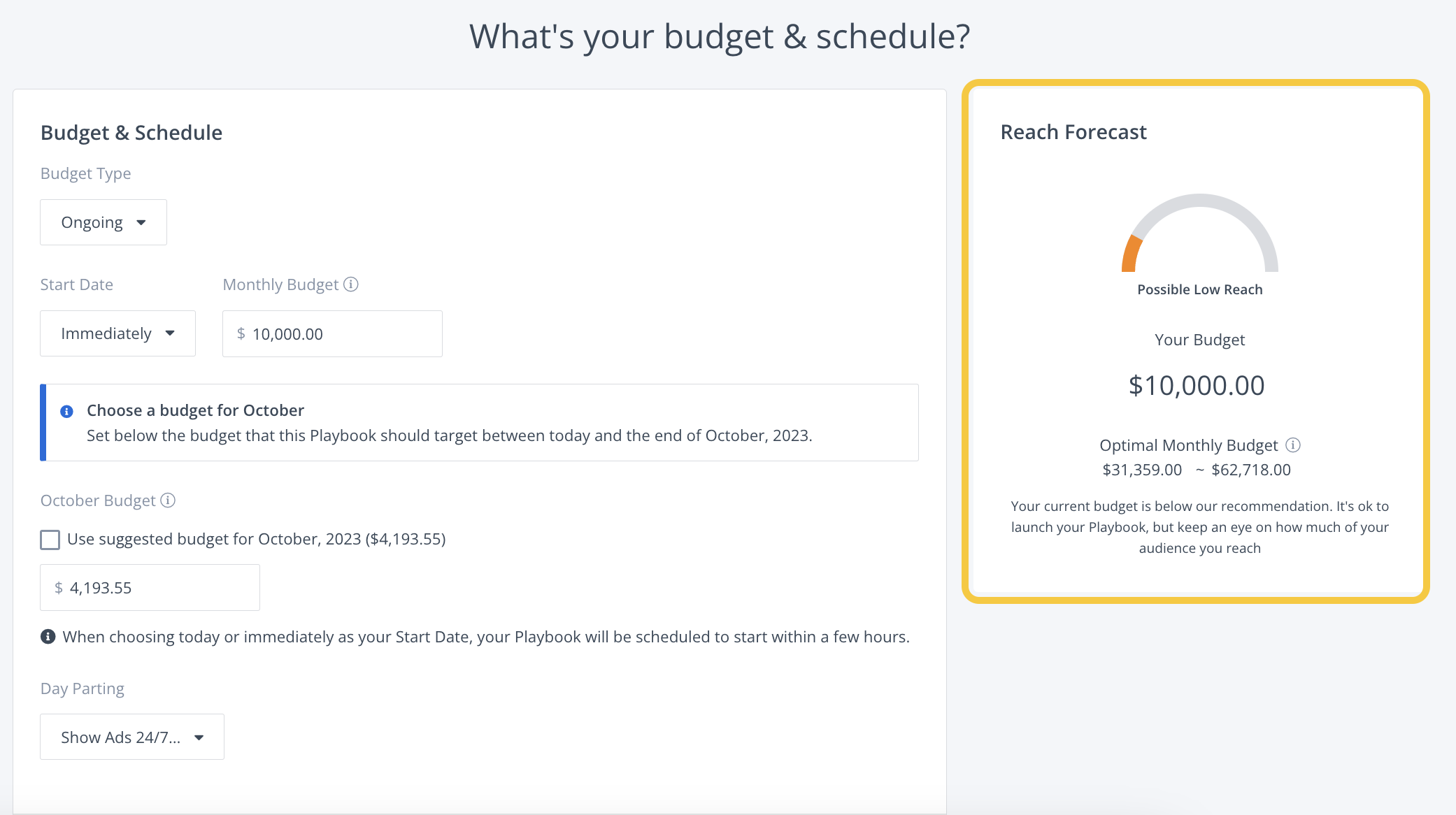 Reach Forecast is based on the size of your audience. It provides you with suggestions on what your optimal monthly budget should be to reach the audience you wish to target effectively.
