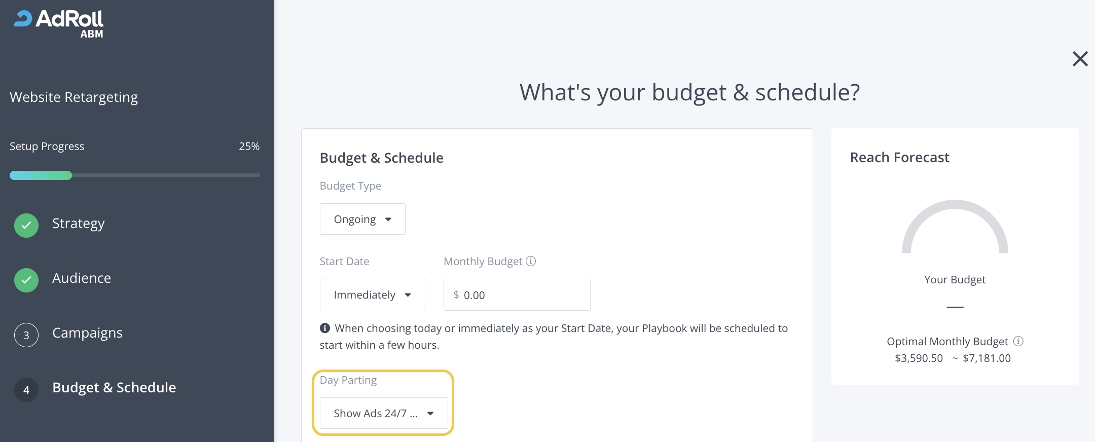 By default, Day Parting is set as automatically run 24/7. We recommend that you use the default Day Parting Playbook settings to let BidIQ® dynamically optimize how many times your ads appear to the same person.