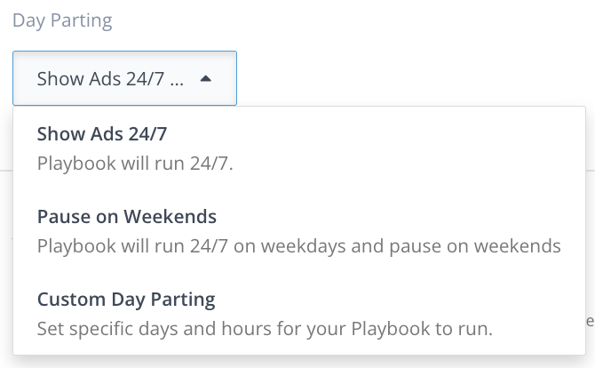 Day Parting is a Playbook setting that gives you control over when your ads serve for a specific playbook. You can use Day Parting to select the specific days of the week that you want your ads to serve and the specific times of the day.