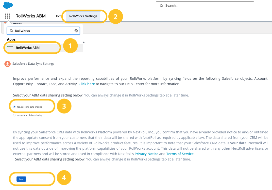 During the initial Installation of the RollWorks ABM app in your Salesforce instance, your CRM administrator must Opt-In the Salesforce Data Sync in the RollWorks ABM app settings.