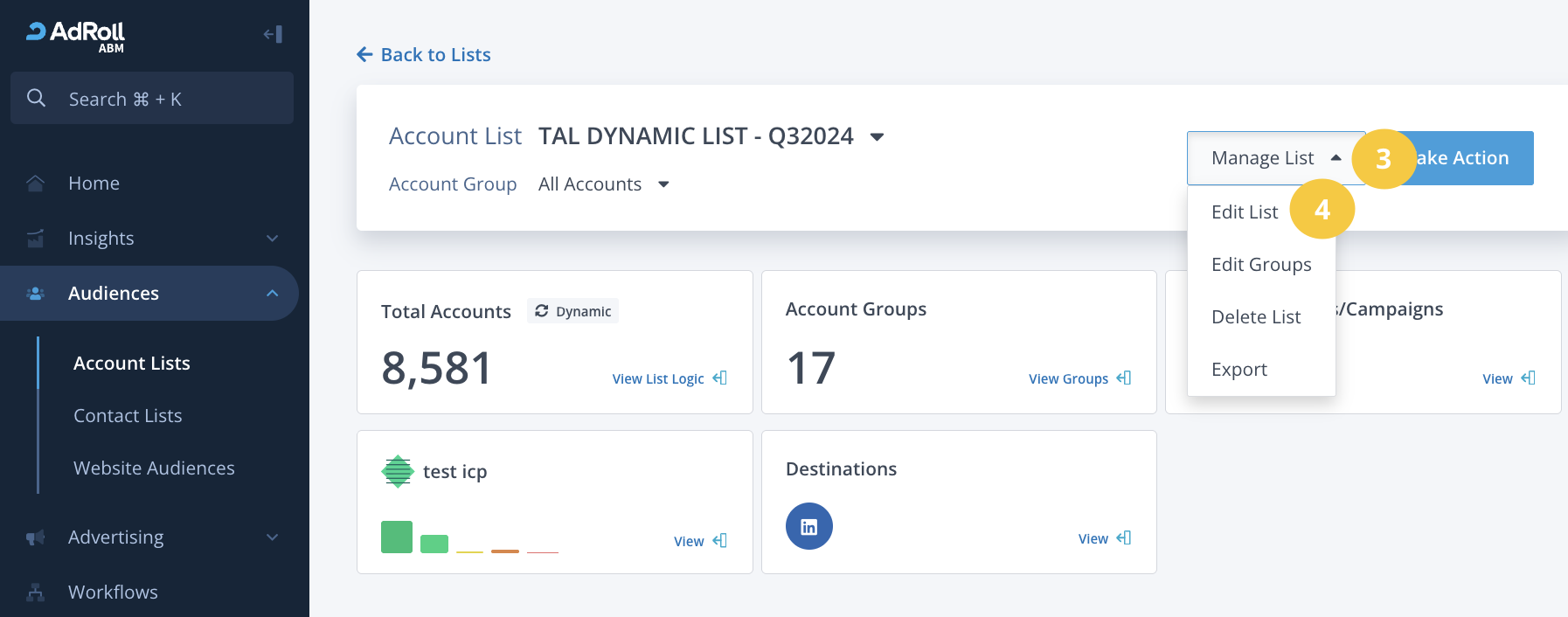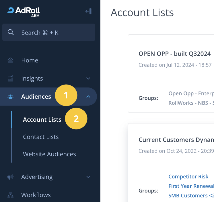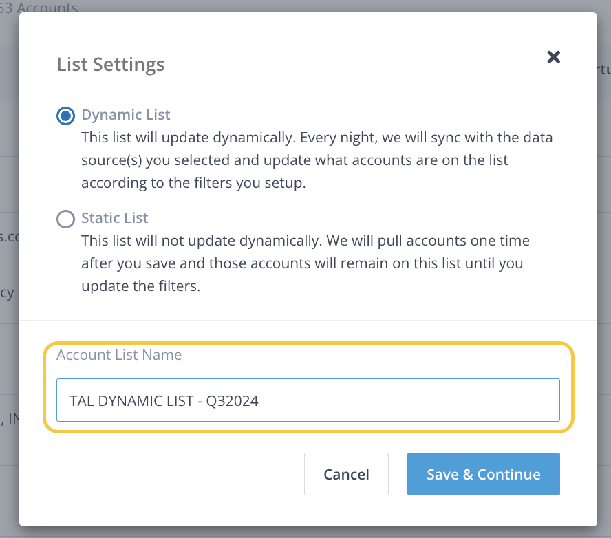 - A dialog box will be prompted, enter the new Account List Name and click on Save & Continue.