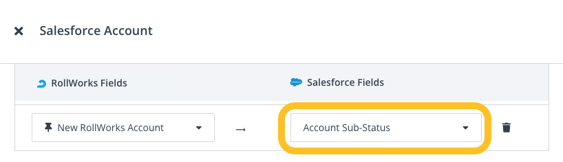 - Select the Salesforce Account field where we should write this static text value. In the example we will write the static value "New RollWorks Account" to the Salesforce Account Field Account Sub-Status.