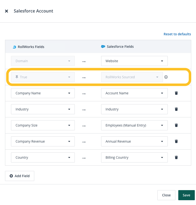 Your CRM admin can use the RollWorks Sourced field to create logic to assign the newly created records to your Sales team or to build reports in Salesforce.