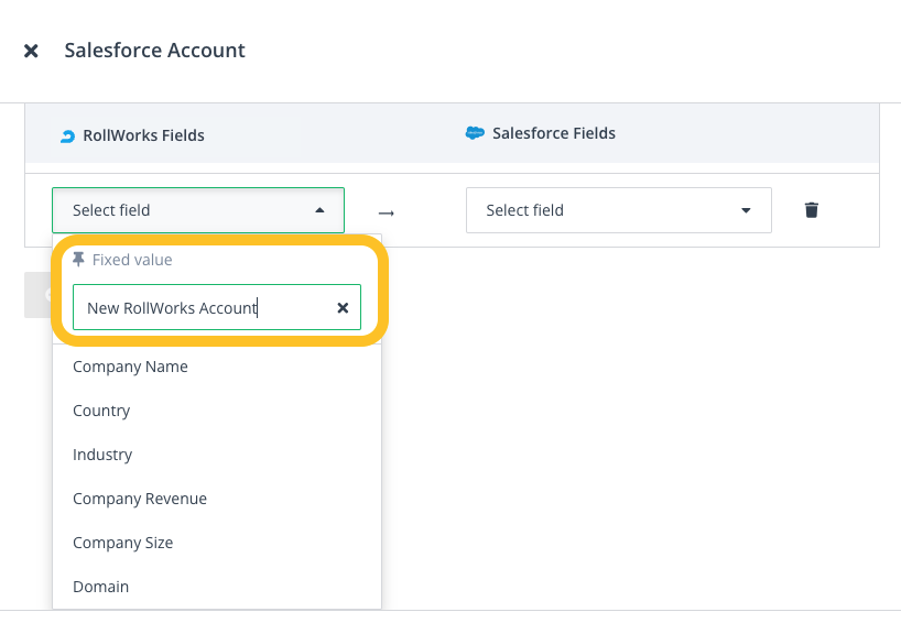 In addition to the fields mentioned in this guide, you can map a static or fixed value to an Account field of your choice.