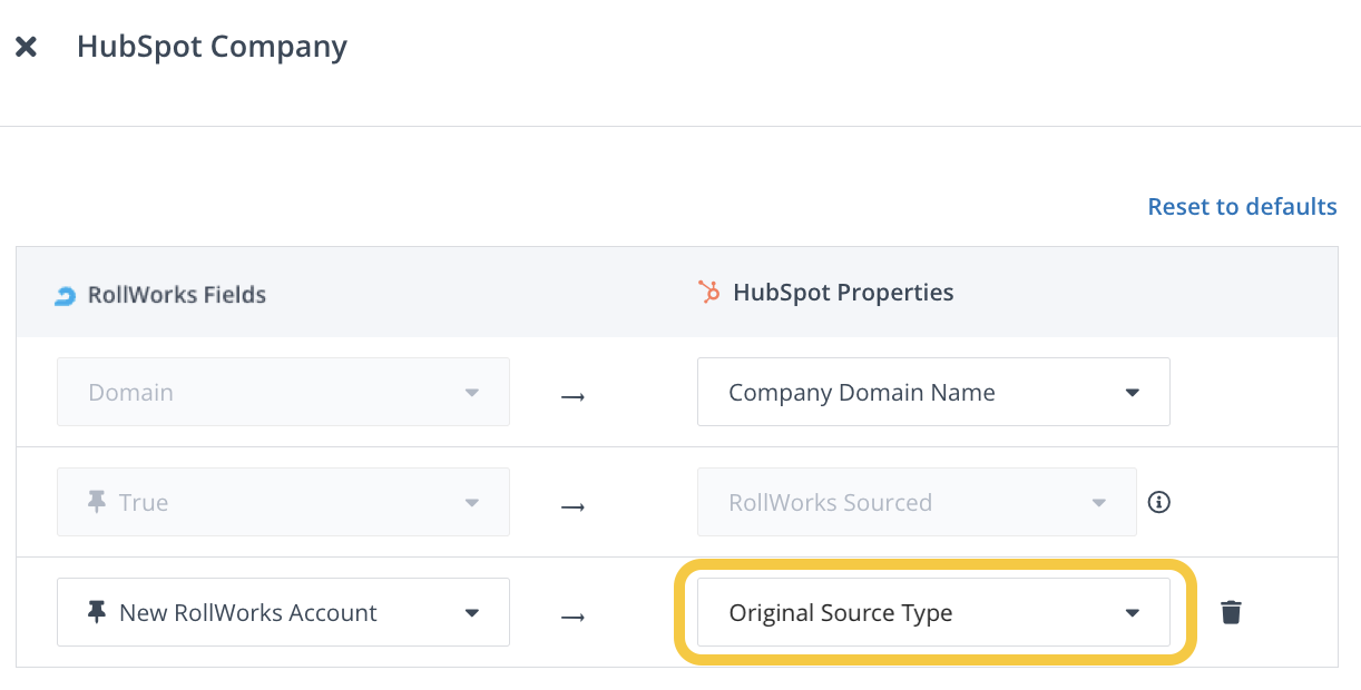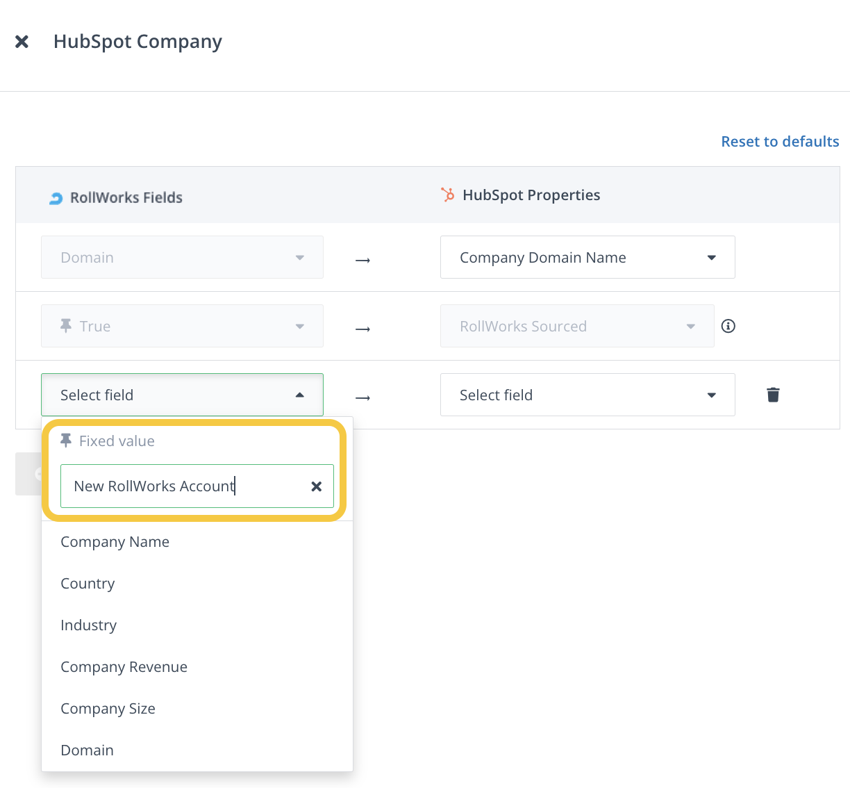 - Select the HubSpot Account field where we should write this static text value. In the example, we will write the static value "New RollWorks Account" to the HubSpot Property "Original Source Type".