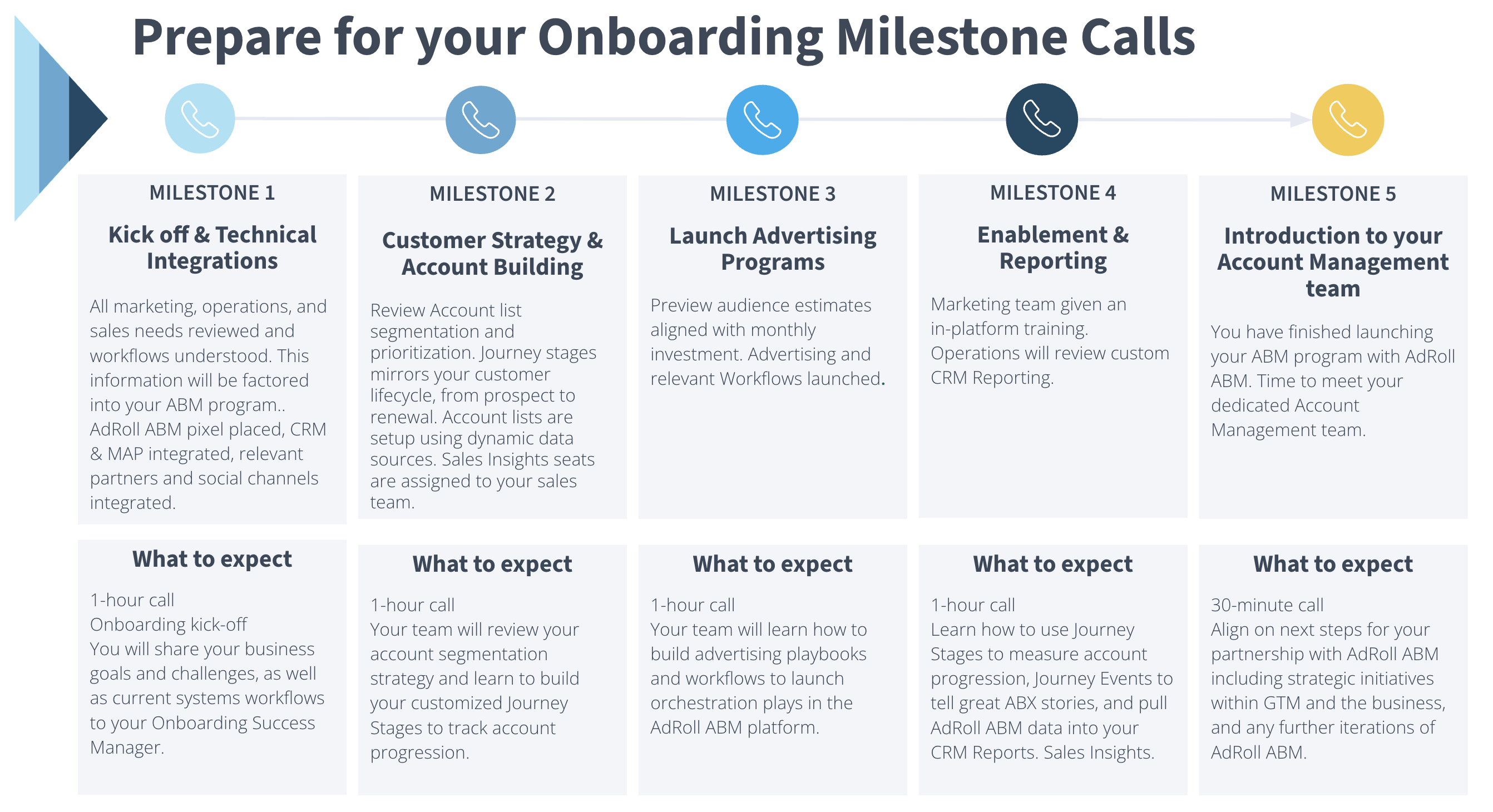 The primary goal of your onboarding is to make sure your program is set up for success. Your dedicated Onboarding Success Manager will guide and enable you every step of the way to make sure you understand how to effectively use all AdRoll ABM platform features to power your account-based program.