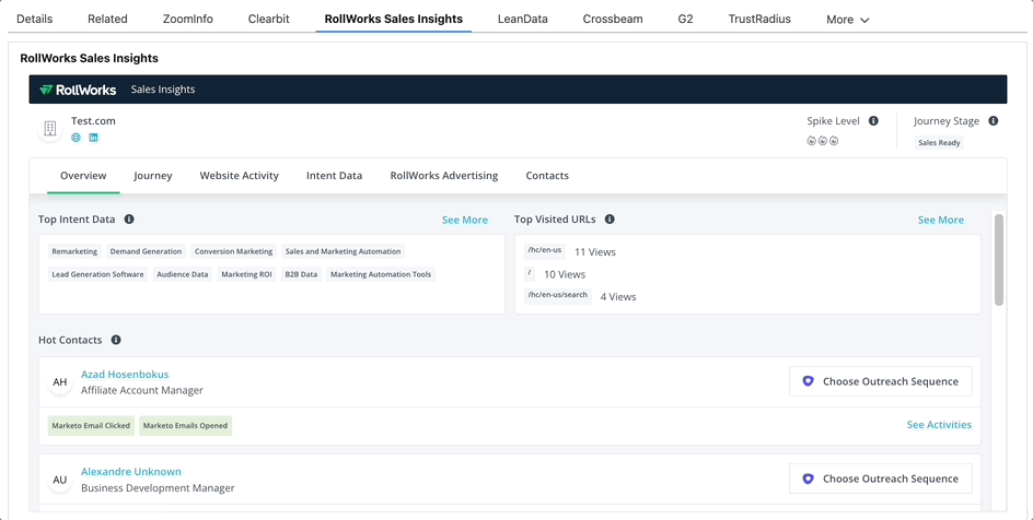 - List of CRM contacts under the spiking account and easy access to launch an Outreach sequence.