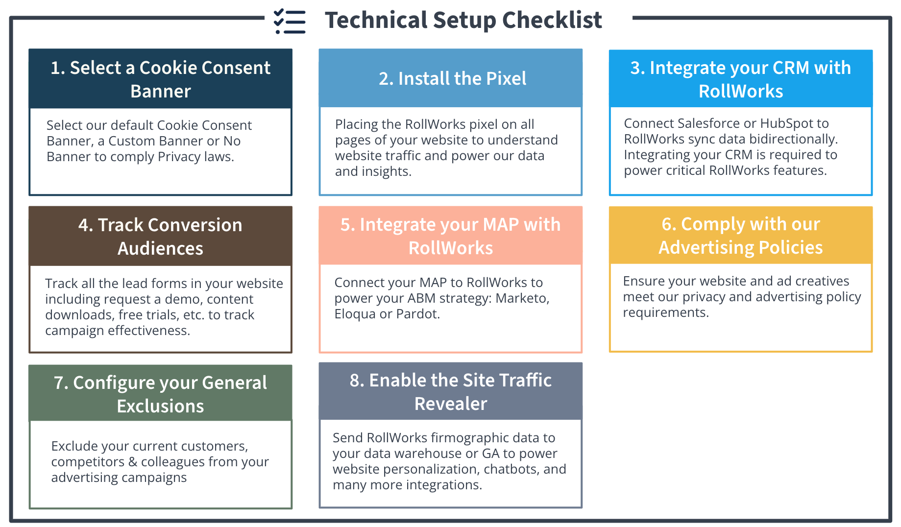 In this guide, we will walk you through the initial technical setup and fundamental AdRoll ABM platform items you must complete before you can launch your first ABM program.