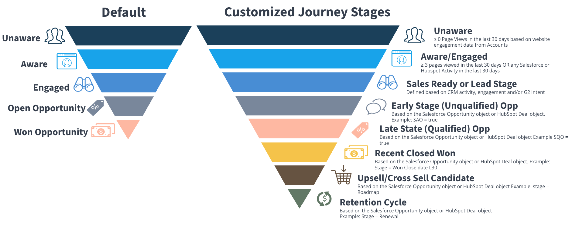 We’ll help you build a better business blueprint by mapping Journey Stages to your full customer lifecycle. We pull in website data, marketing automation, CRM, and intent data to define these conditions custom to your business. Once set up this way, you’ll be able to measure account progression through these stages, involve these stages in targeting to diversify revenue tactics, and have this data back in CRM to give the rest of your organization visibility into where accounts sit.