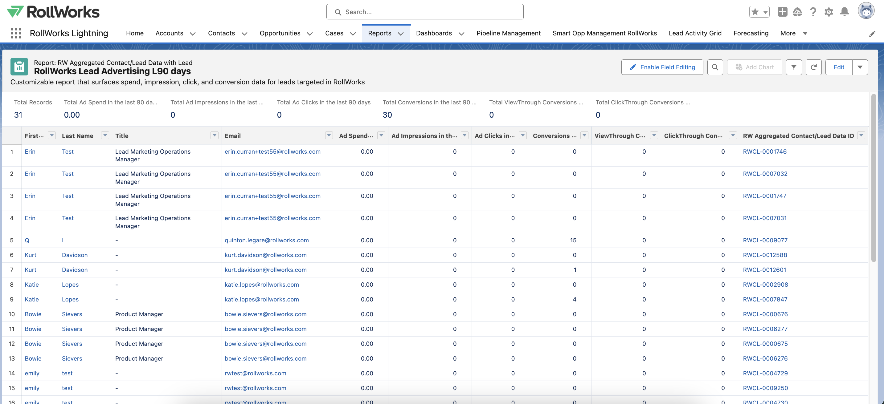 The advertising metrics above are aggregated for each lead for the last 90 days. For each RollWorks advertising metric above we provide 3 different custom fields to replicate this report using different look-back periods: last 7 days, last 30 days, and last 90 days.