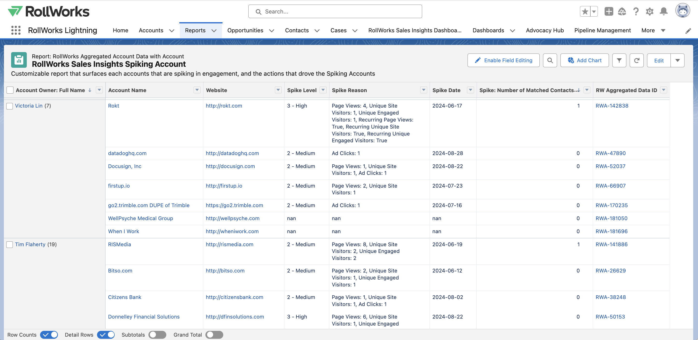 Only after you have completed the initial setup of Sales Insights and you have assigned Sales Insights seats to your sales team, this report will will begin populating data. The RollWorks Sales Insights Spiking Account report will show you a list of Accounts spiking based on our proprietary account spike data science model, showing accounts with increased levels of engagement compared to a previous 3 business day baseline. Learn how Account Spikes are calculated here.