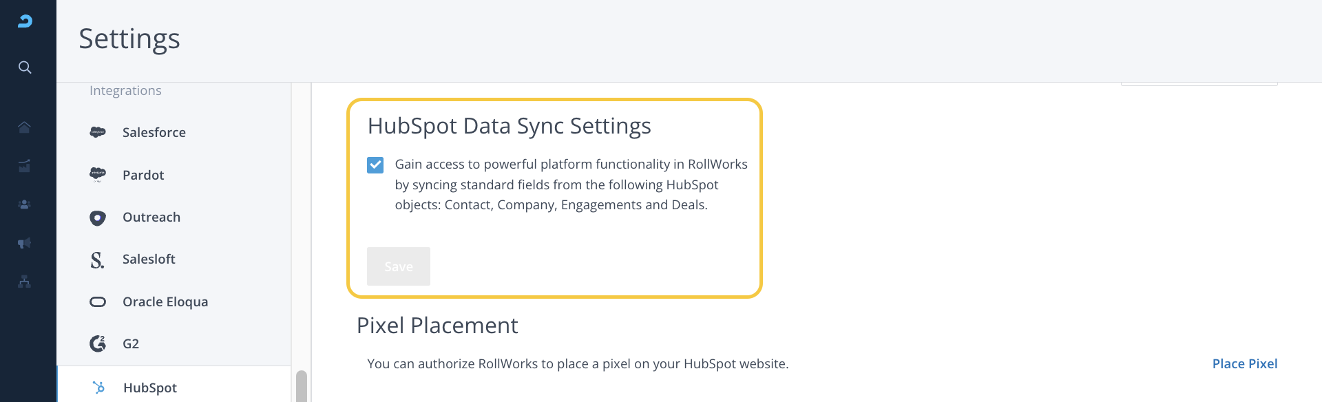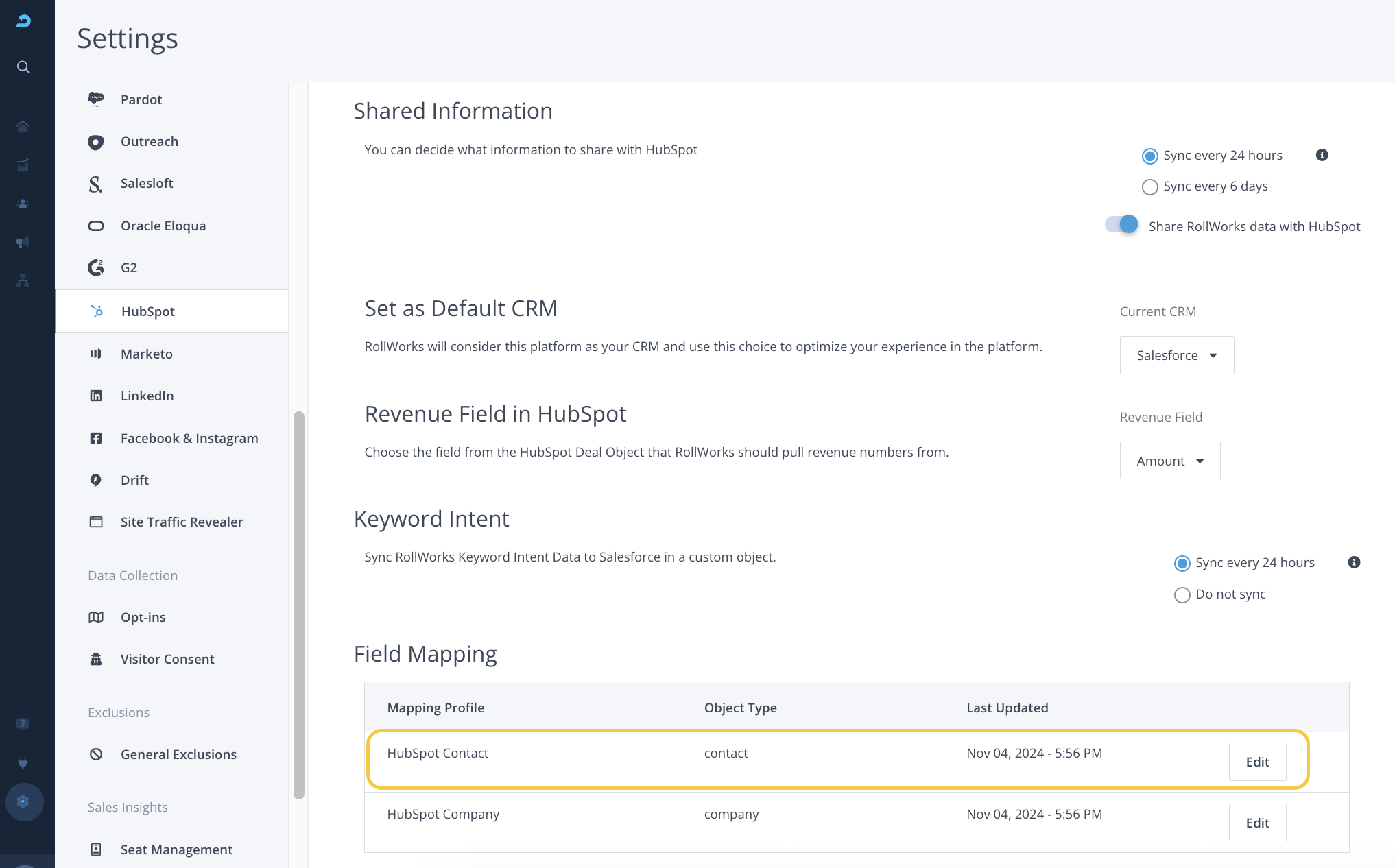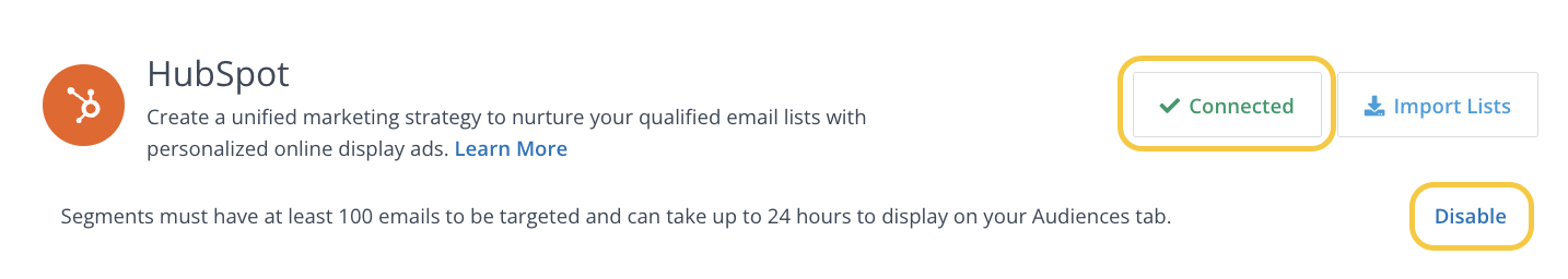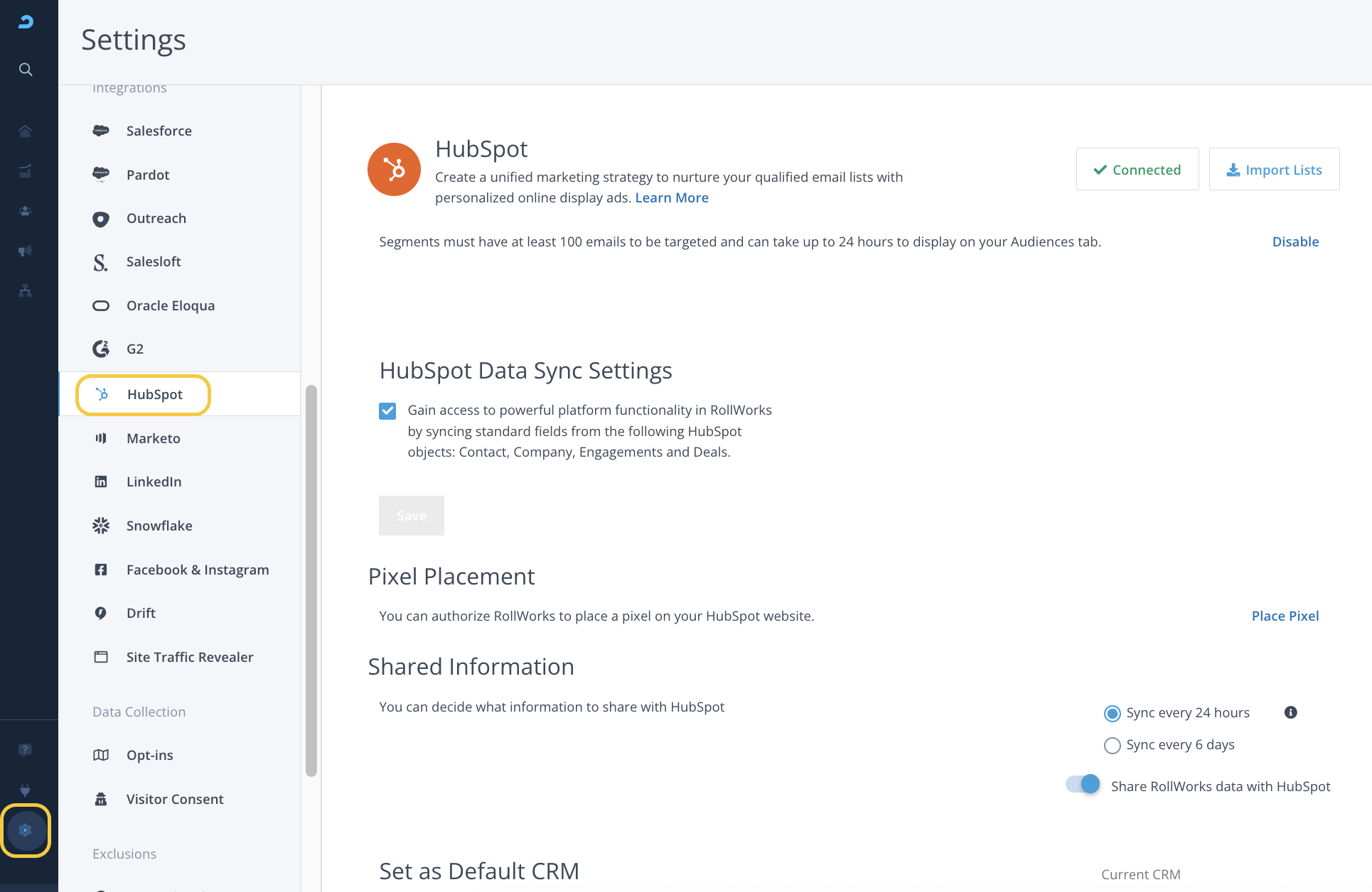 To adjust your HubSpot Integration Settings, click here or log in to AdRoll ABM platform and navigate to Settings > HubSpot. If you have not integrated AdRoll with your HubSpot, you will not be able to access these settings. Follow the steps in this article to complete the initial integration setup.