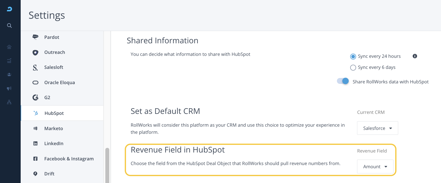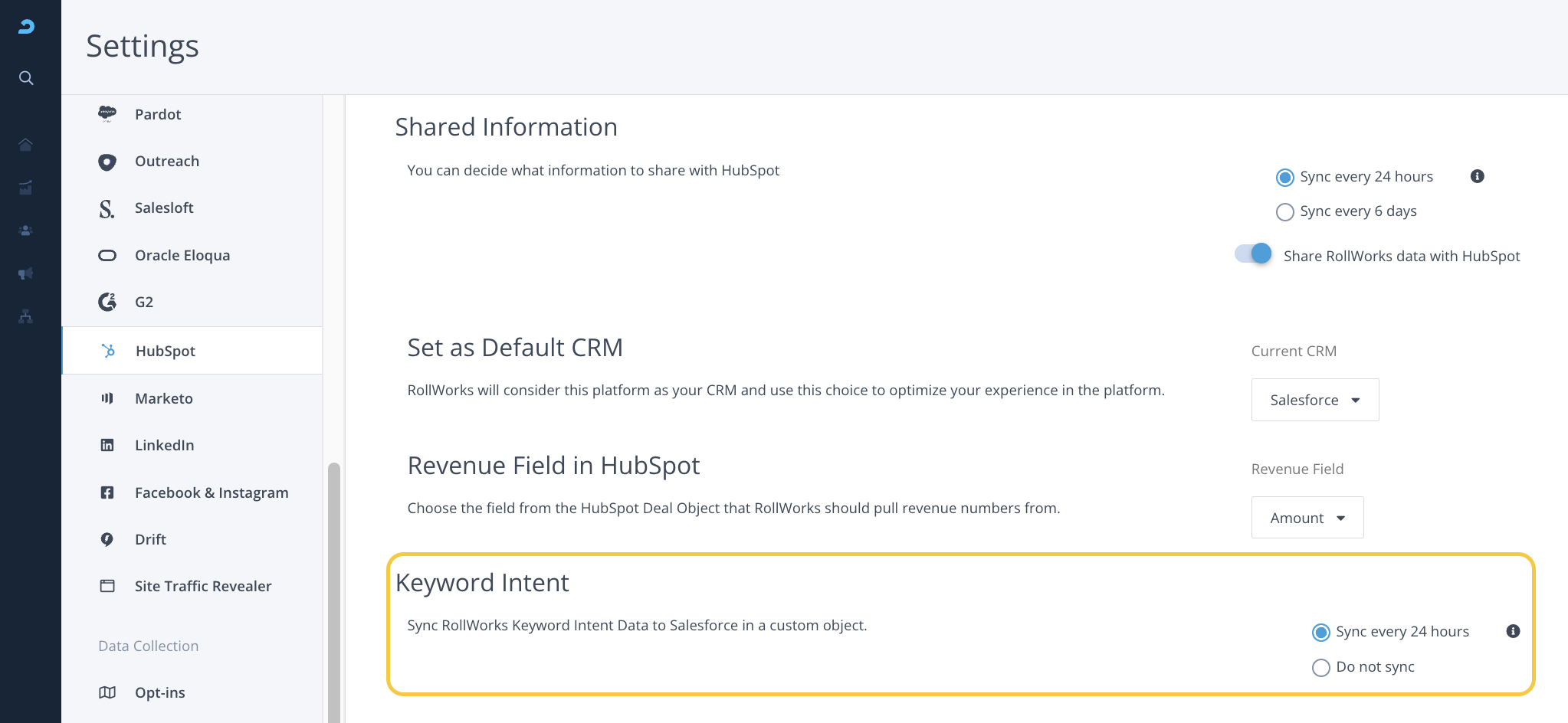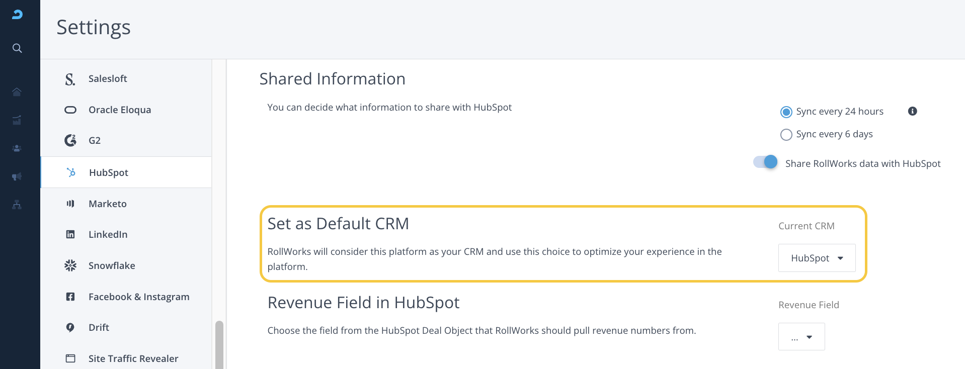 In the event that you have both Salesforce and HubSpot integrated with AdRoll, this setting allows you to select which one should be your Default CRM. AdRoll will consider this CRM to optimize your experience in the AdRoll ABM platform.