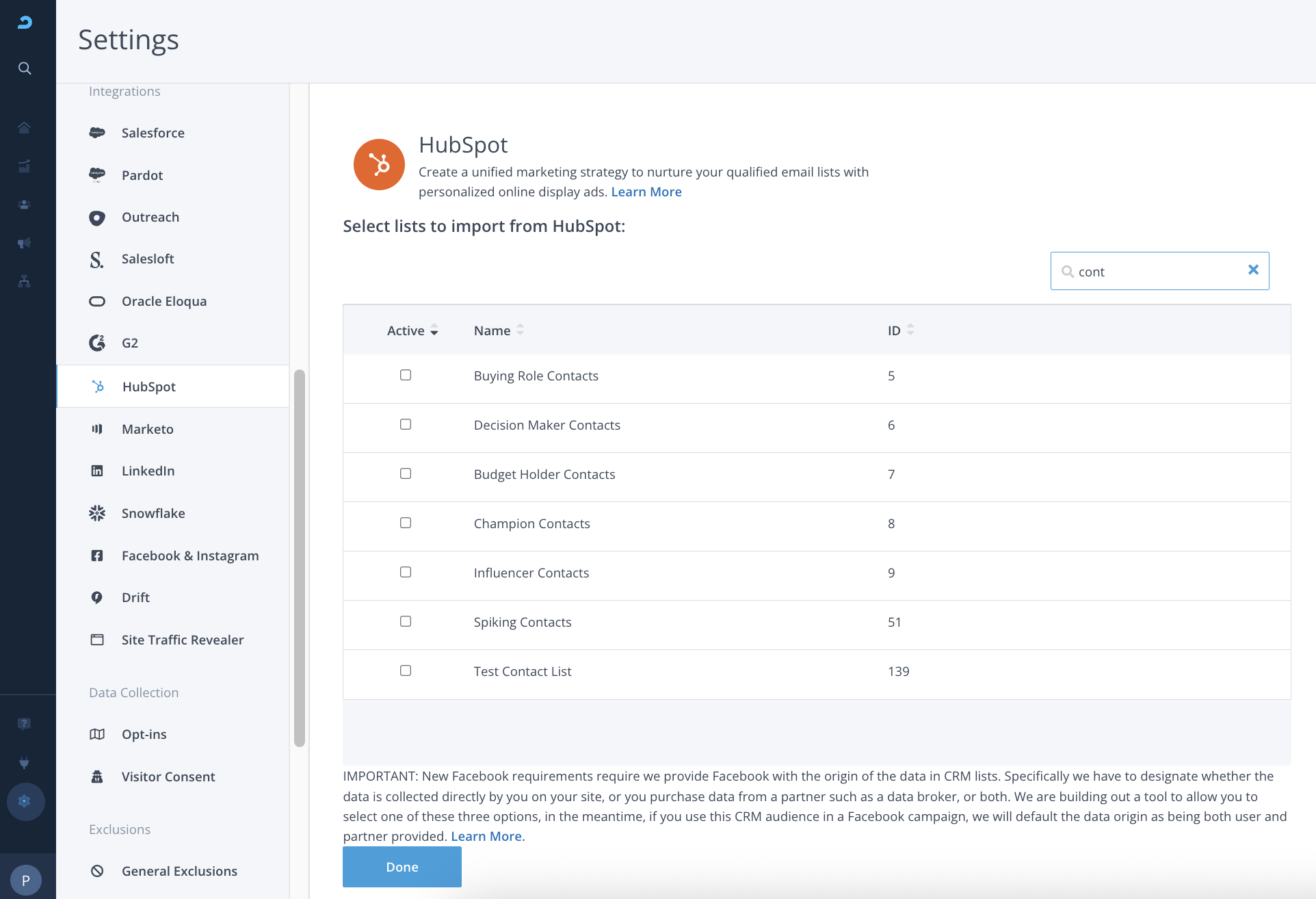 This section allows you to select the HubSpot Contact Lists that you wish to import to AdRoll.