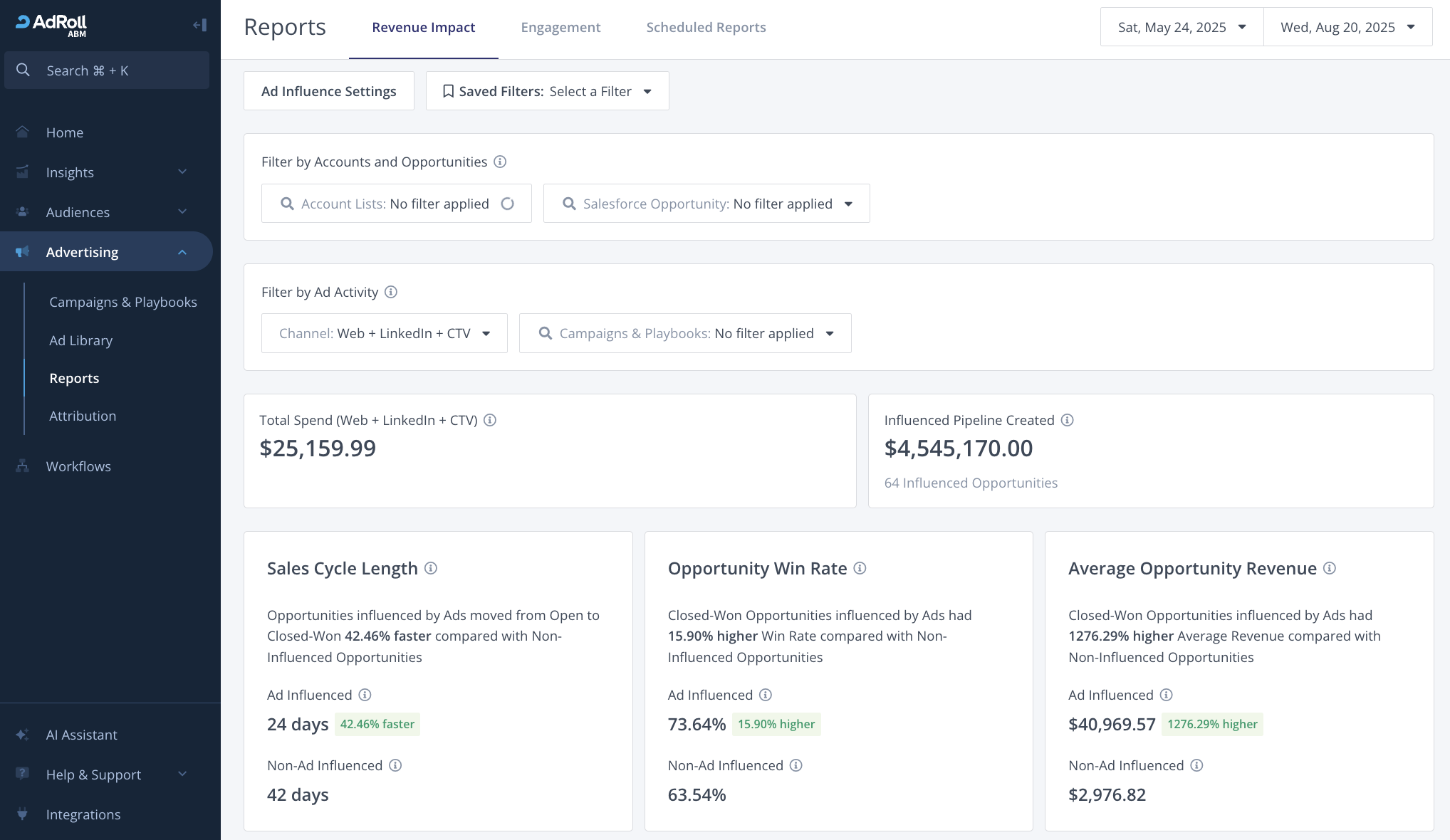 - Revenue Impact report: this report uses your CRM data to show the influence of AdRoll advertising in your pipeline volume, potential revenue, closed won revenue, and deal velocity.