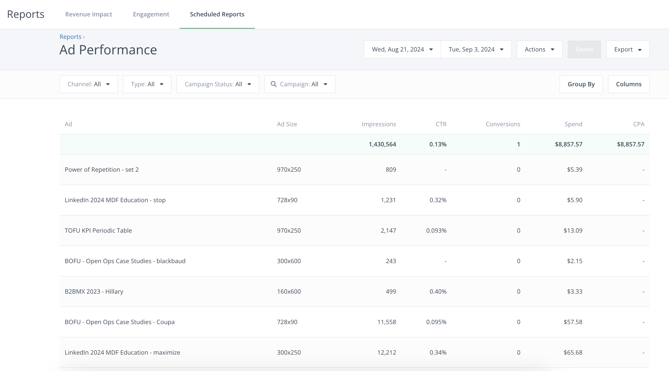 The Ad Performance Report helps you understand the performance of each individual ad creative. You will be able to compare ad metrics such as impressions, clicks, spend, and others among your ad creatives. That will help you to determine which ads are the most effective and which ones you should update or remove.