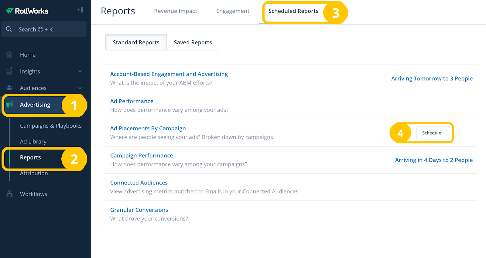 - Log in to your AdRoll ABM account, go to Advertising Reports, and click the tab Scheduled Reports.