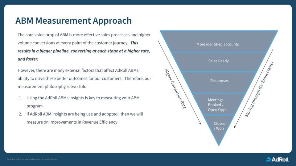 The promise of ABM is to identify the right accounts that will progress through the buying journey at a higher rate and faster, resulting in a higher volume pipeline and faster conversions. Sales alignment and timely sales action on insights are crucial for realizing this value.