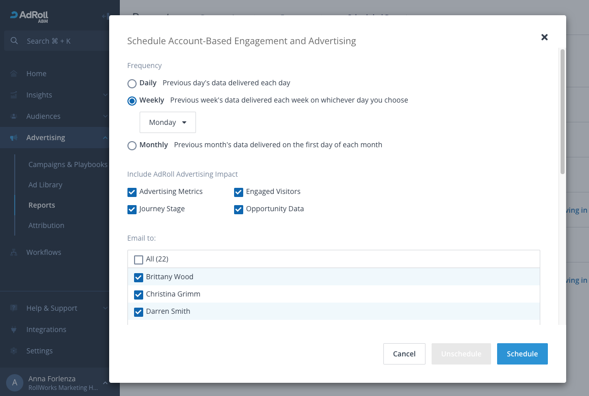 - Log in to AdRoll ABM, go to Advertising Reports, and click the tab Scheduled Reports.