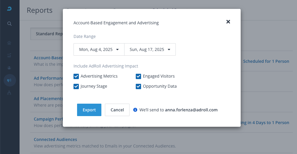 - Log in to AdRoll ABM, go to Advertising > Reports, and click the tab Scheduled Reports.