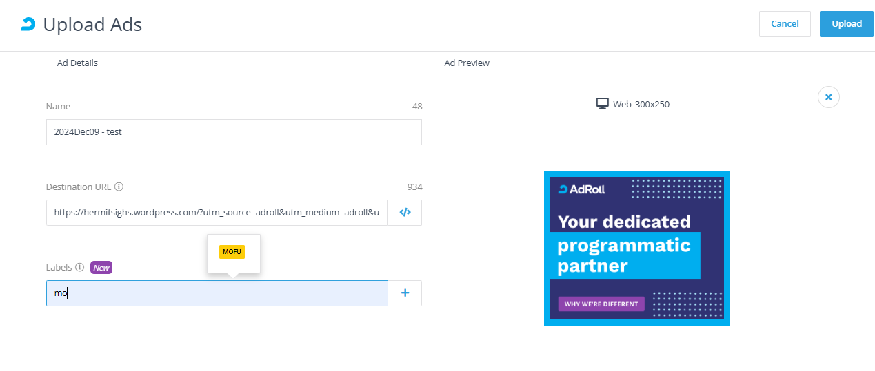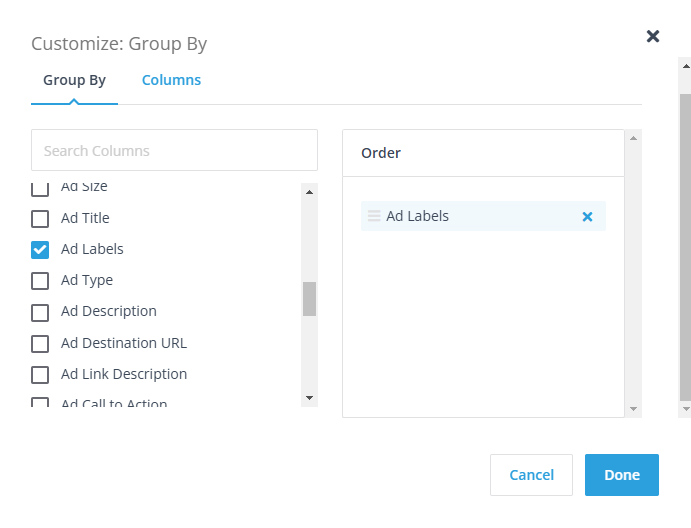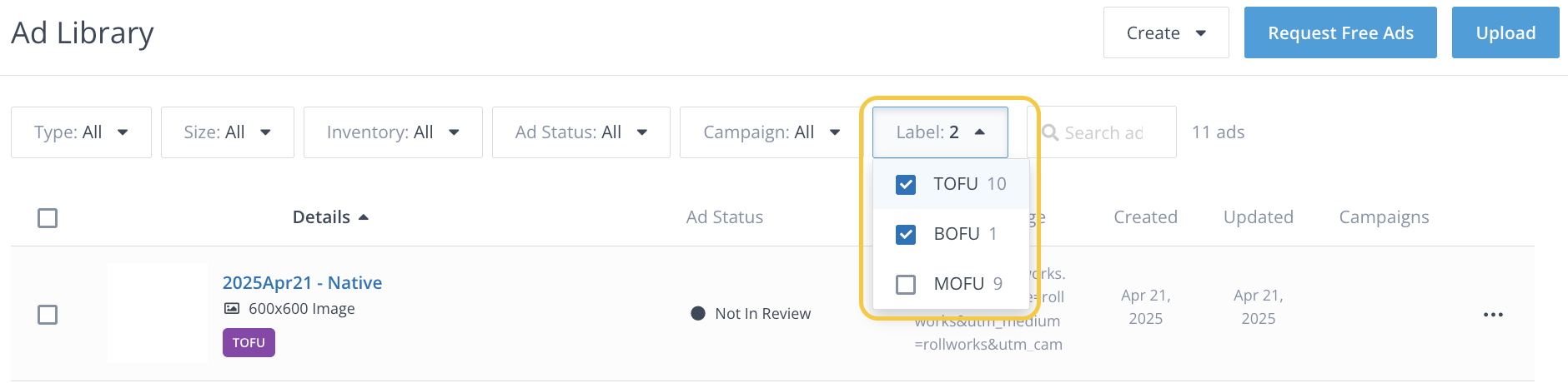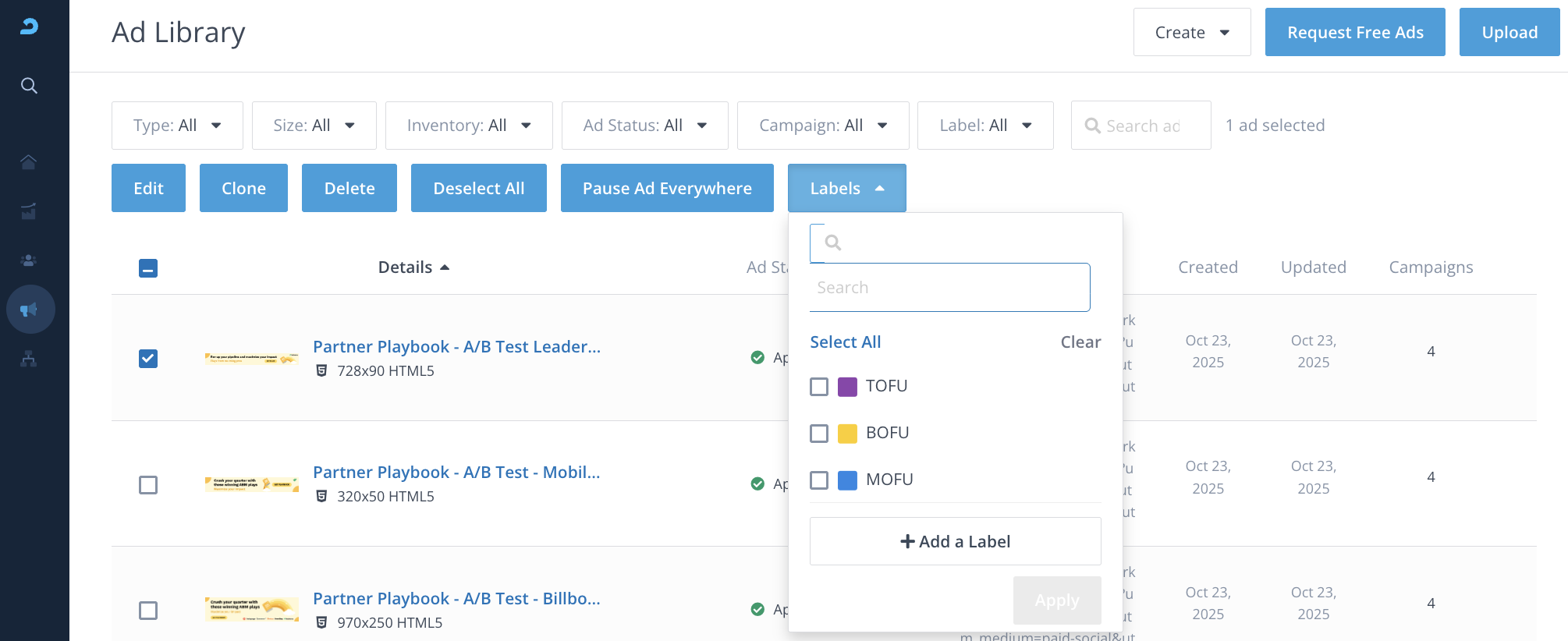 Ad Labels help you to organize your creative ads into meaningful groups so that you can easily filter, search, manage, and select ads when creating a campaign without scrolling through multiple rows of ads.