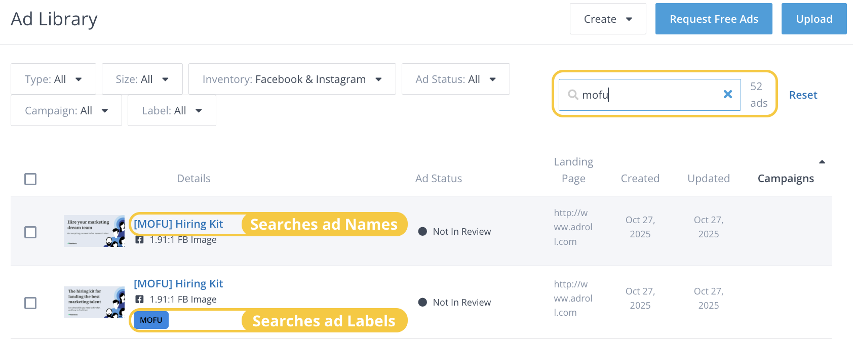 - The results will show both the ads tagged with a specific Label and ads containing the search term in their name
