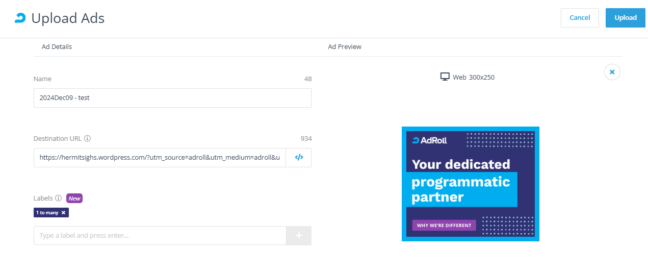 - Fill out the necessary fields, like Ad Name and Destination URL