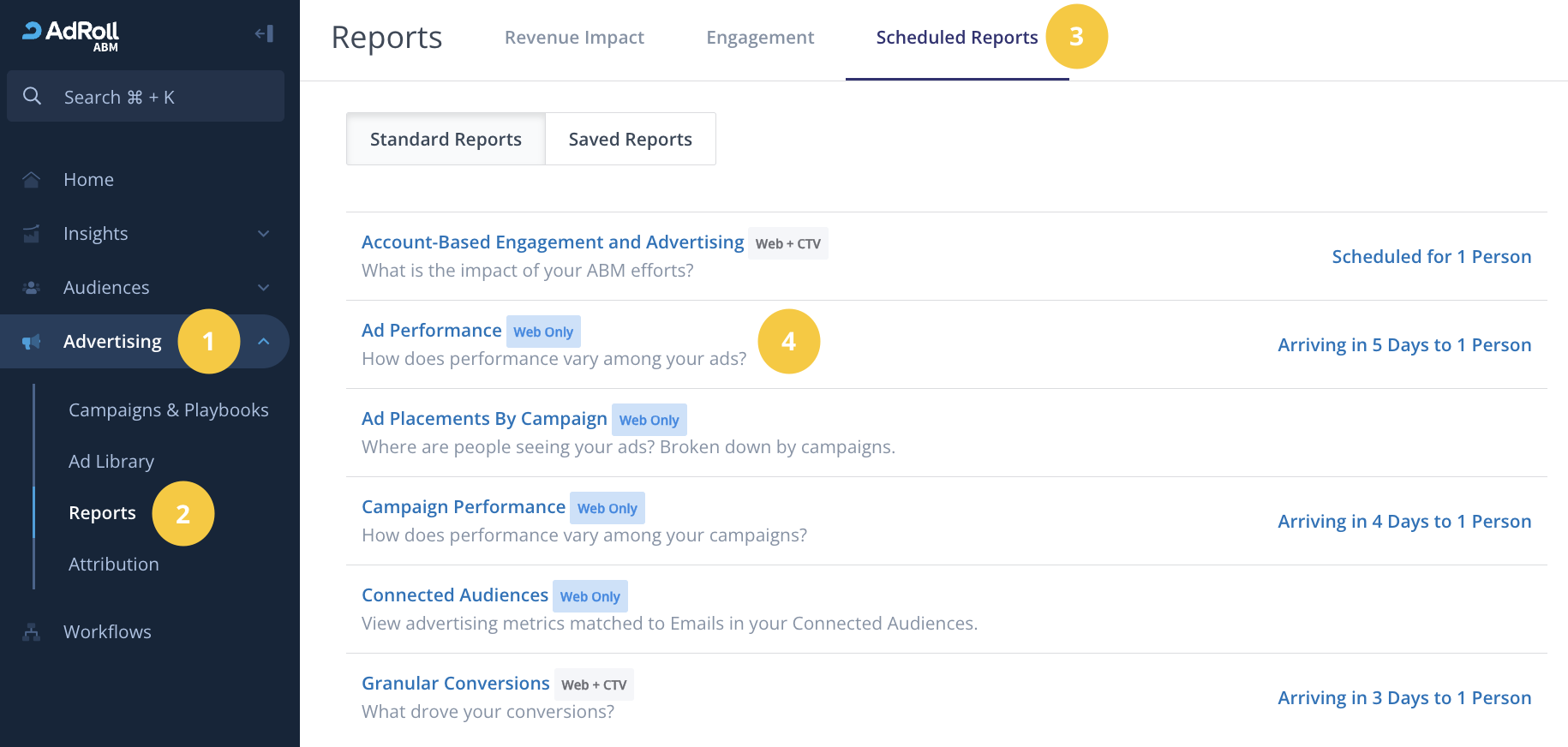 - Navigate to Advertising > Reports > Scheduled Reports > Ad Performance report